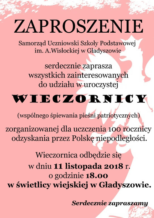 Samorząd Uczniów Szkoły Podstawowej w Gładyszowie wraz z nauczycielami serdecznie zaprasza wszystkich uczniów wraz z rodzicami oraz całą społeczość naszej małej ojczyzny na Wieczornicę z z okazji 100 rocznicy Odzyskania przez Polskę Niepodległości.
