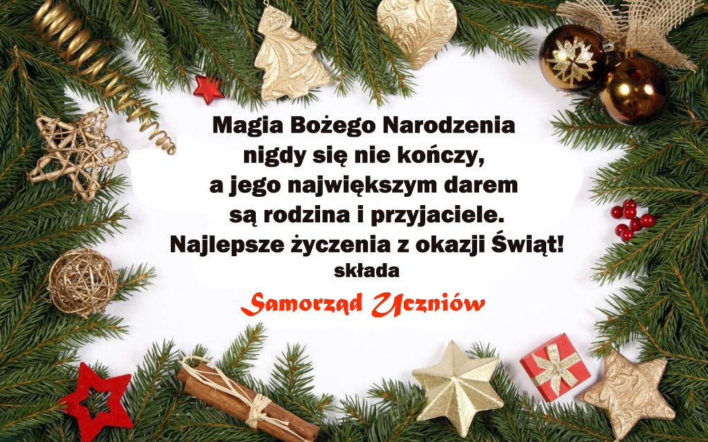 W tych wyjątkowych dniach życzymy wszystkim uczniom, nauczycielom, pracownikom administracji i obsługi wiele zadowolenia i sukcesów z podjętych wyzwań. Niech magia Świąt Bożego Narodzenia wypełnia ciepłem wszystkie mroźne dni a Nowy Rok 2019 niesie ze sobą szczęście i pomyślność.