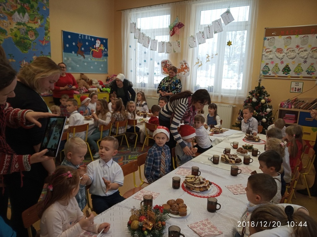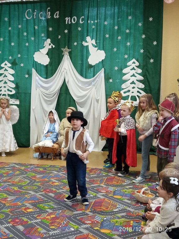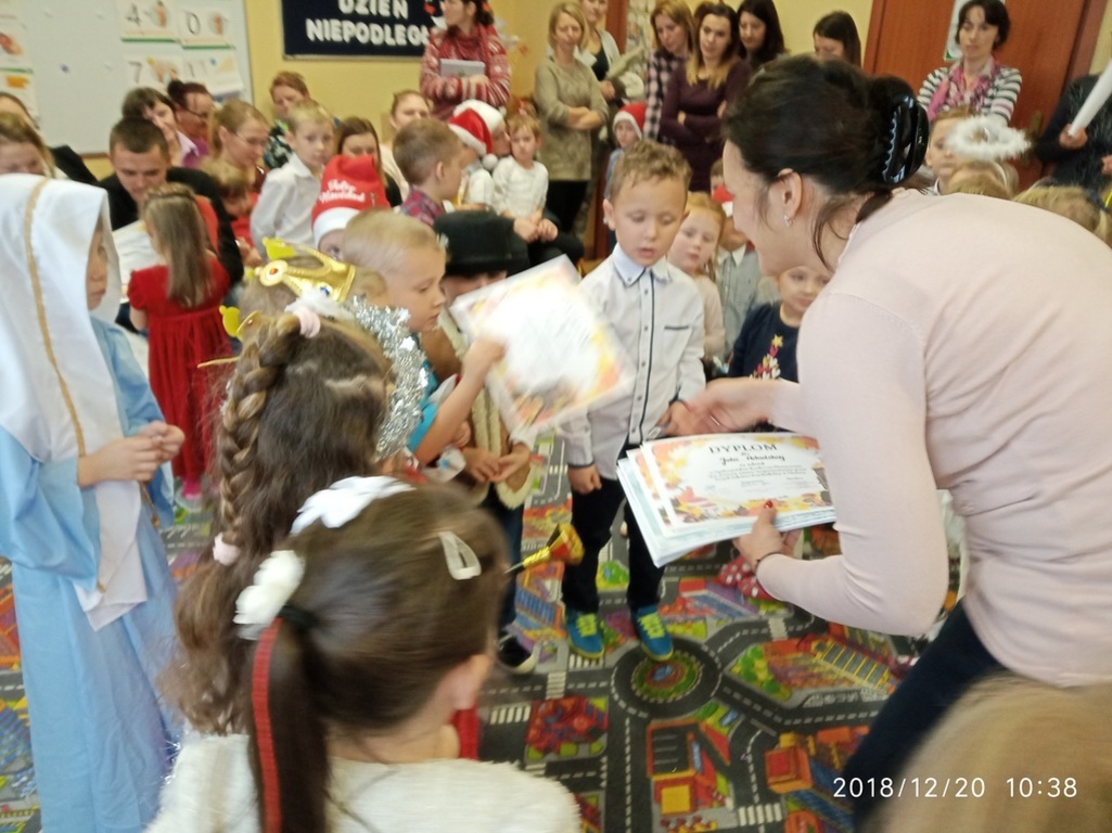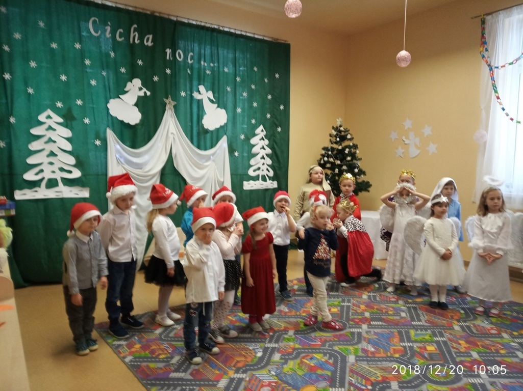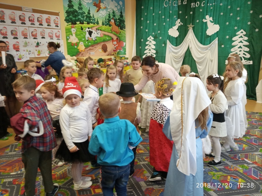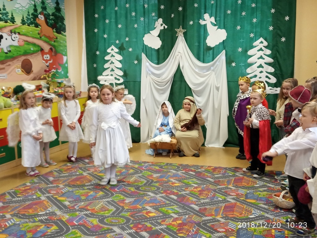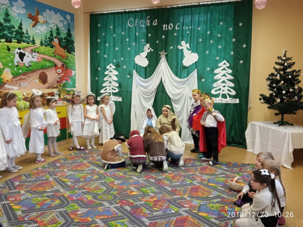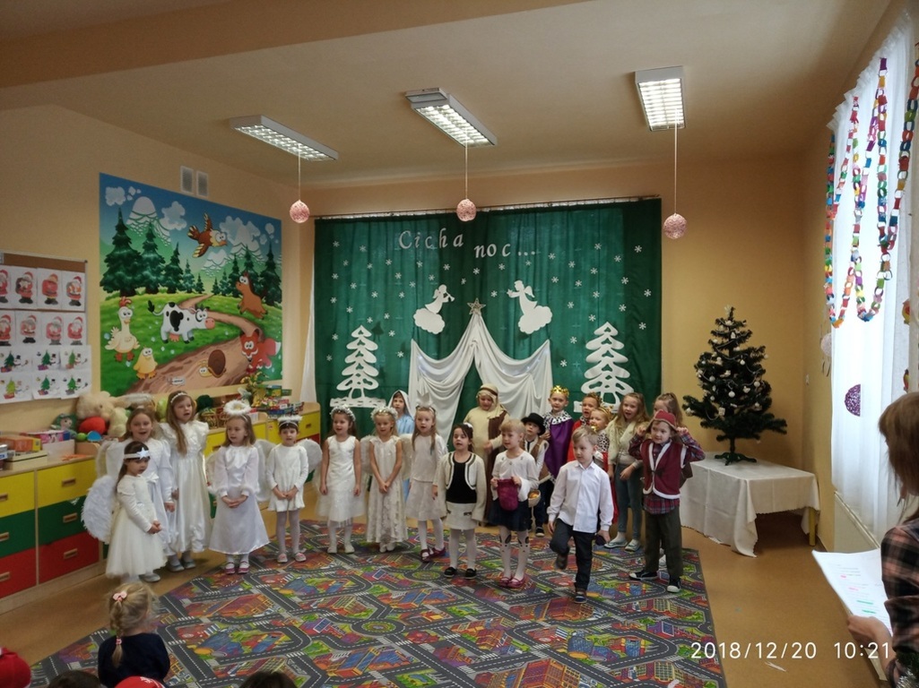 20 grudnia 2018 w przedszkolu były przedstawiane Jasełka. Niektóre przedszkolaki po raz pierwszy wcieliły się w postacie związane z narodzinami Pana Jezusa. Był więc Józef i Maryja, Aniołowie, Pastuszkowie oraz Królowie. Piękna sceneria, odpowiednie stroje oraz śpiewanie wspólnie kolęd wprowadziły zgromadzonych w świąteczny nastrój. Po wystepach pani Dyrektor złożyła dzieciom, nauczycielom, zaproszonym gościom najlepsze bożonarodzeniowe życzenia. Rozdała również dyplomy dzieciom, które zostały wyróznione w różnych konkursach. Po przedstawieniu odbyła się Wigilia, gdzie wszystkie grupy przedszkolne łamały się opłatkiem. Zasiadając do odświętnie nakrytego stołu dzieci jadły przygotowane przez rodziców wigilijne potrawy. Atmosfera była prawdziwie rodzinna, a odświetne stroje wszystkich podkreślały rangę tego dnia.
