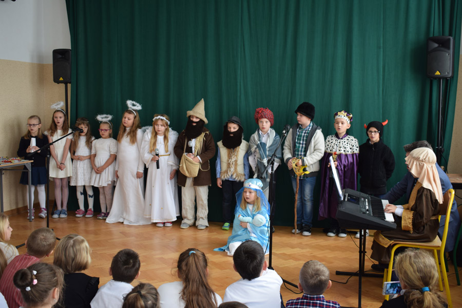Następnie uczestniczyliśmy w Jasełkach wystawionych przez klasę III pod opieką p. Nadziei Firlit. Przedstawienie przy akompaniamecie muzycznym (to był szkolny debiut Marka) było pełne symboli i tradycji bożonarodzeniowych. Później przyszedł czas na wspólne kolędowanie. Wkońcu nastąpiło uroczyste wręczenie nagród dla uczestników szkolnego konkursu na najpiękniejszą bombkę.