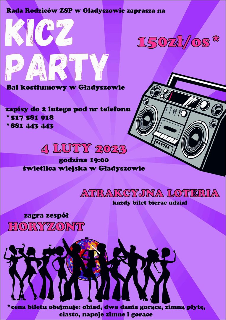 Serdecznie zpraszamy na bal karnawałowy organizowany przez Radę Rodziców ZSP w Gładyszowie. Bal odbędzie się 4 lutego 2023roku. Tym razem temat przewodni to KICZ PARTY! Dochód z balu będzie przeznaczony na dzieci z przedszkola i szkoły podstawowej w Gładyszowie.