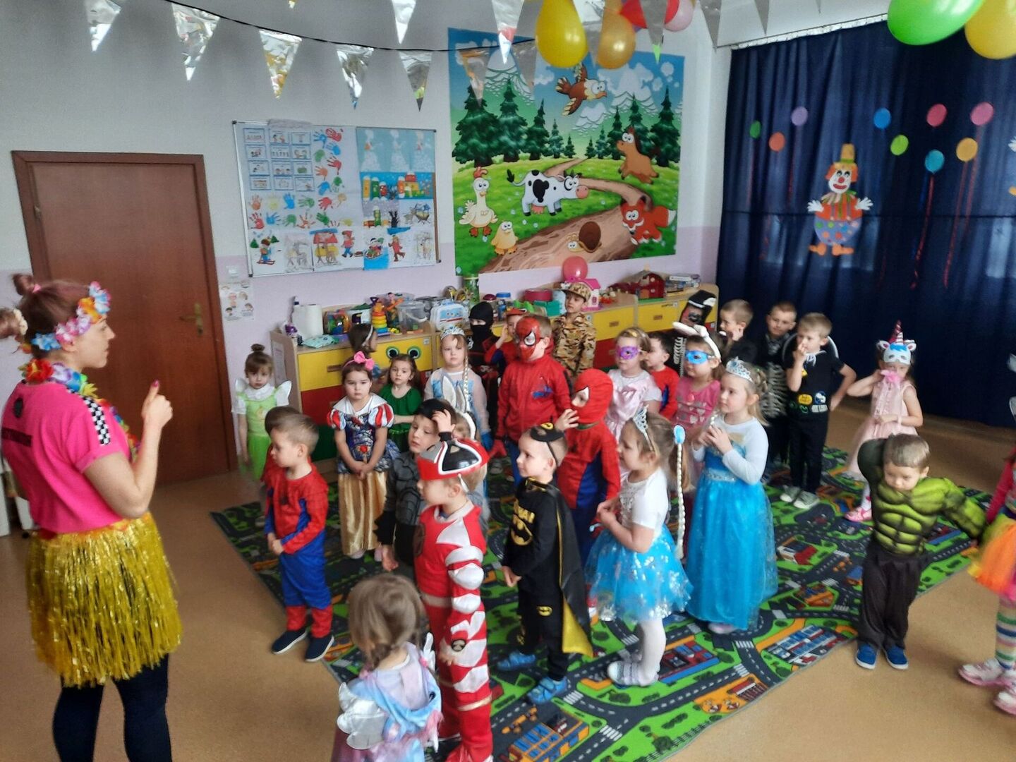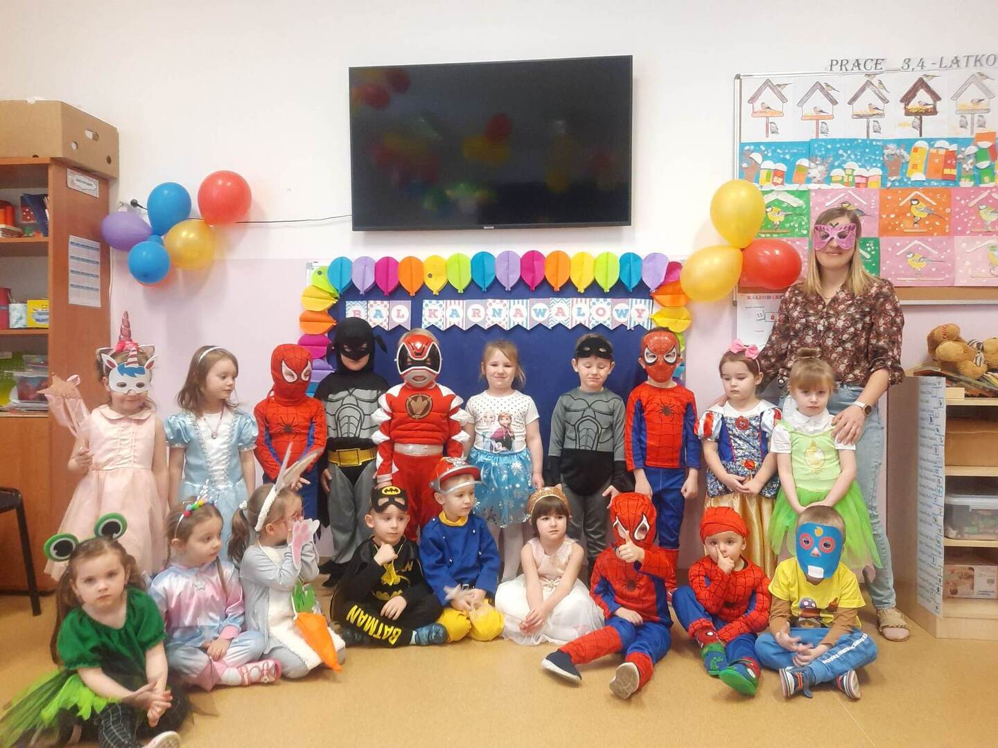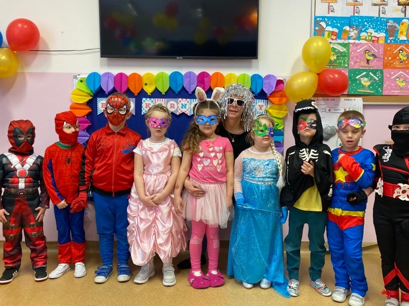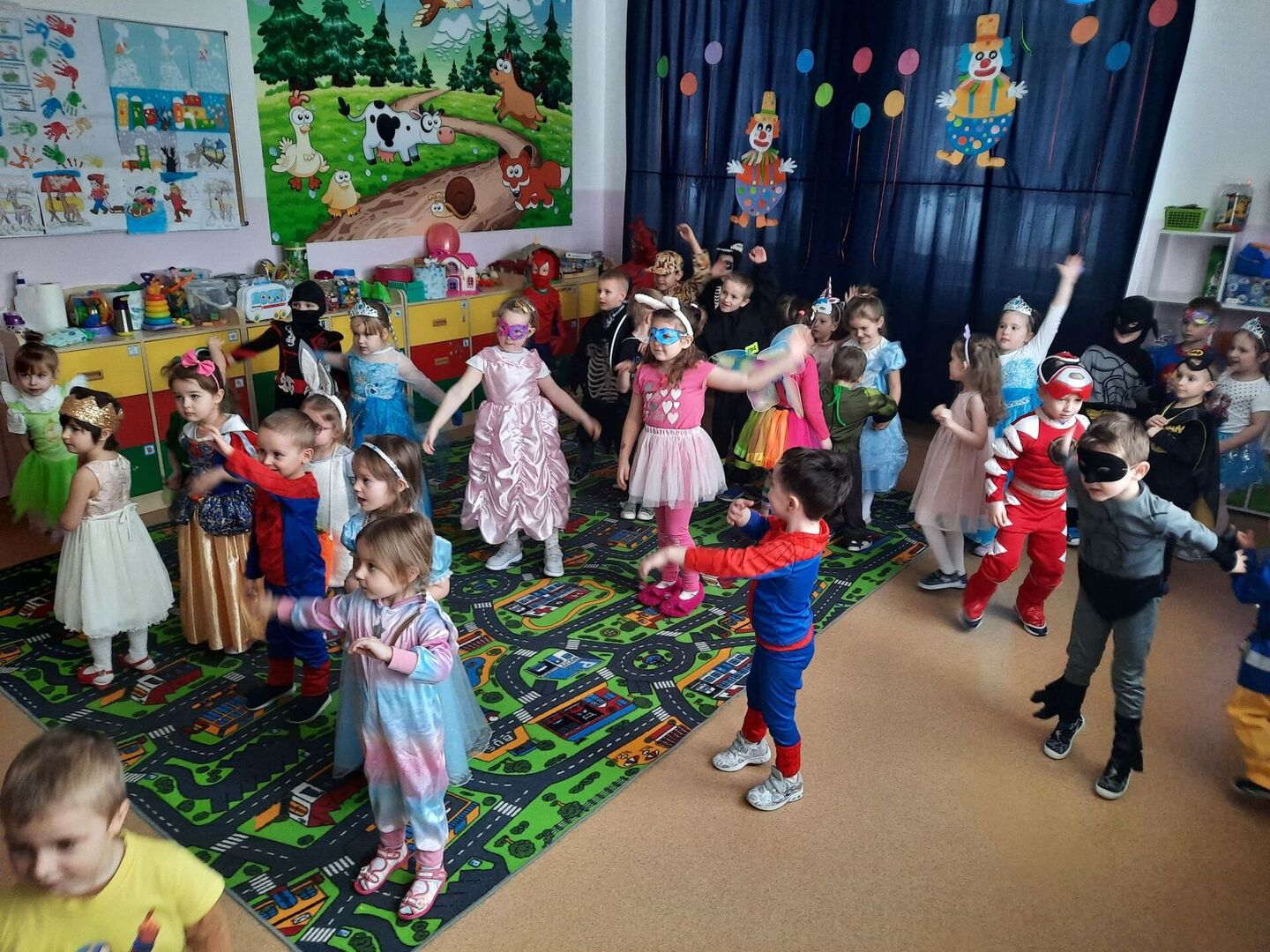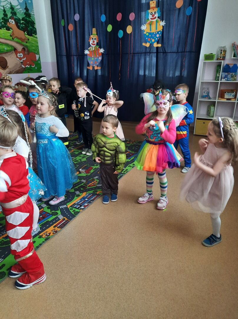 Tego dnia już od rana w przedszkolu pojawiały się kolorowe postacie. Dzieci przebrane były za bohaterów znanych bajek, w salach przedszkolnych można było spotkać wróżki, królewny, księżniczki, motylki, rycerzy, piratów, policjantów, Spider-Mana, Batmany i wiele innych. Wcześniej przygotowany wystrój sali wprowadził w radosny nastrój oraz zachęcał wszystkich do wesołej zabawy.