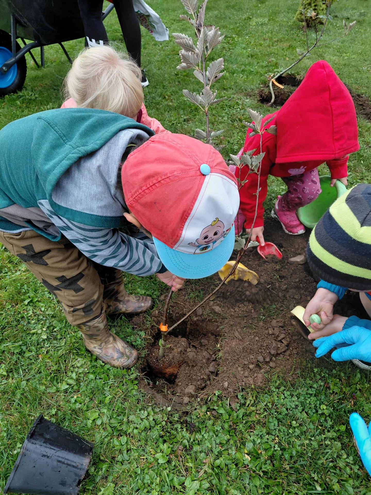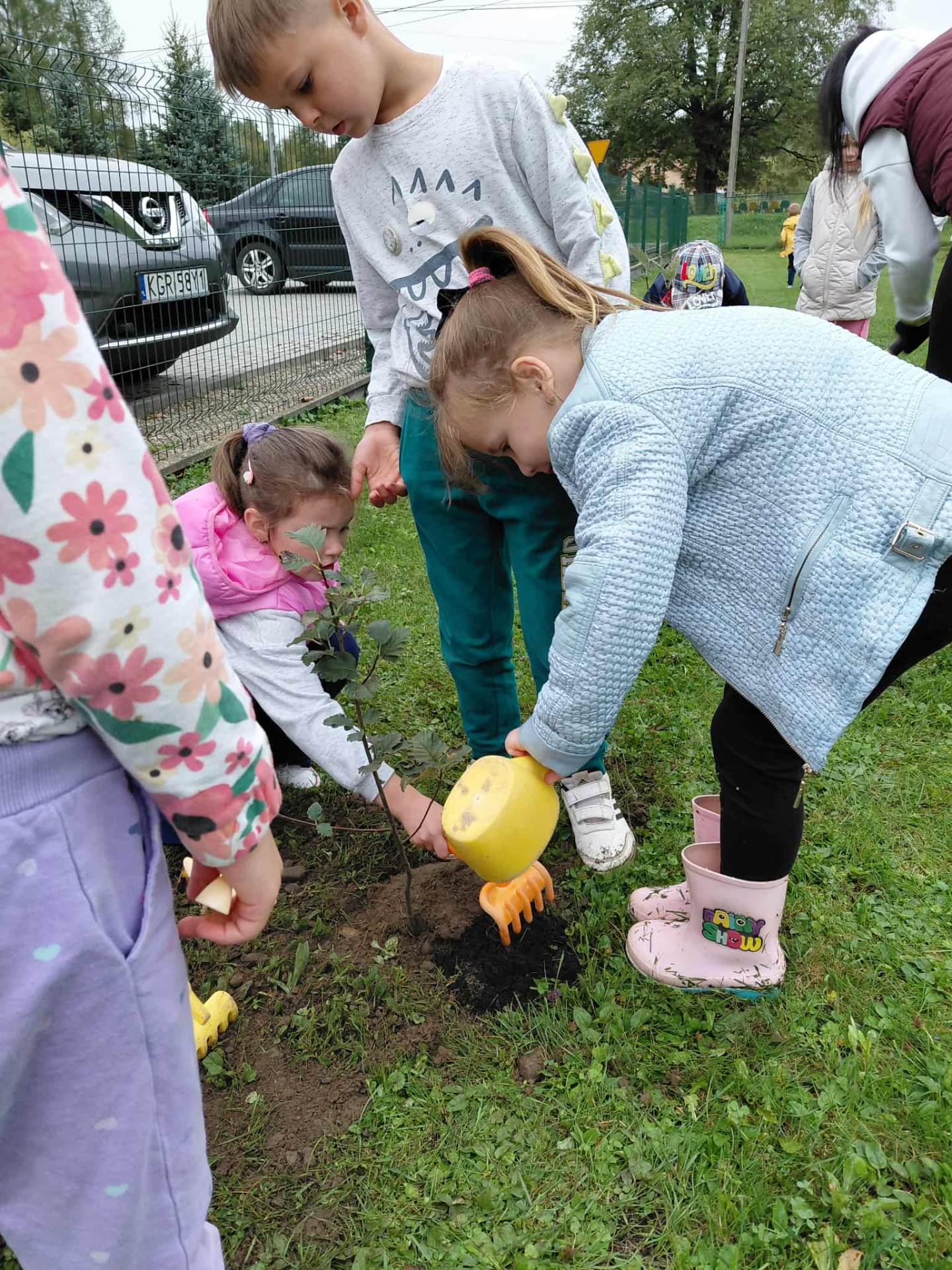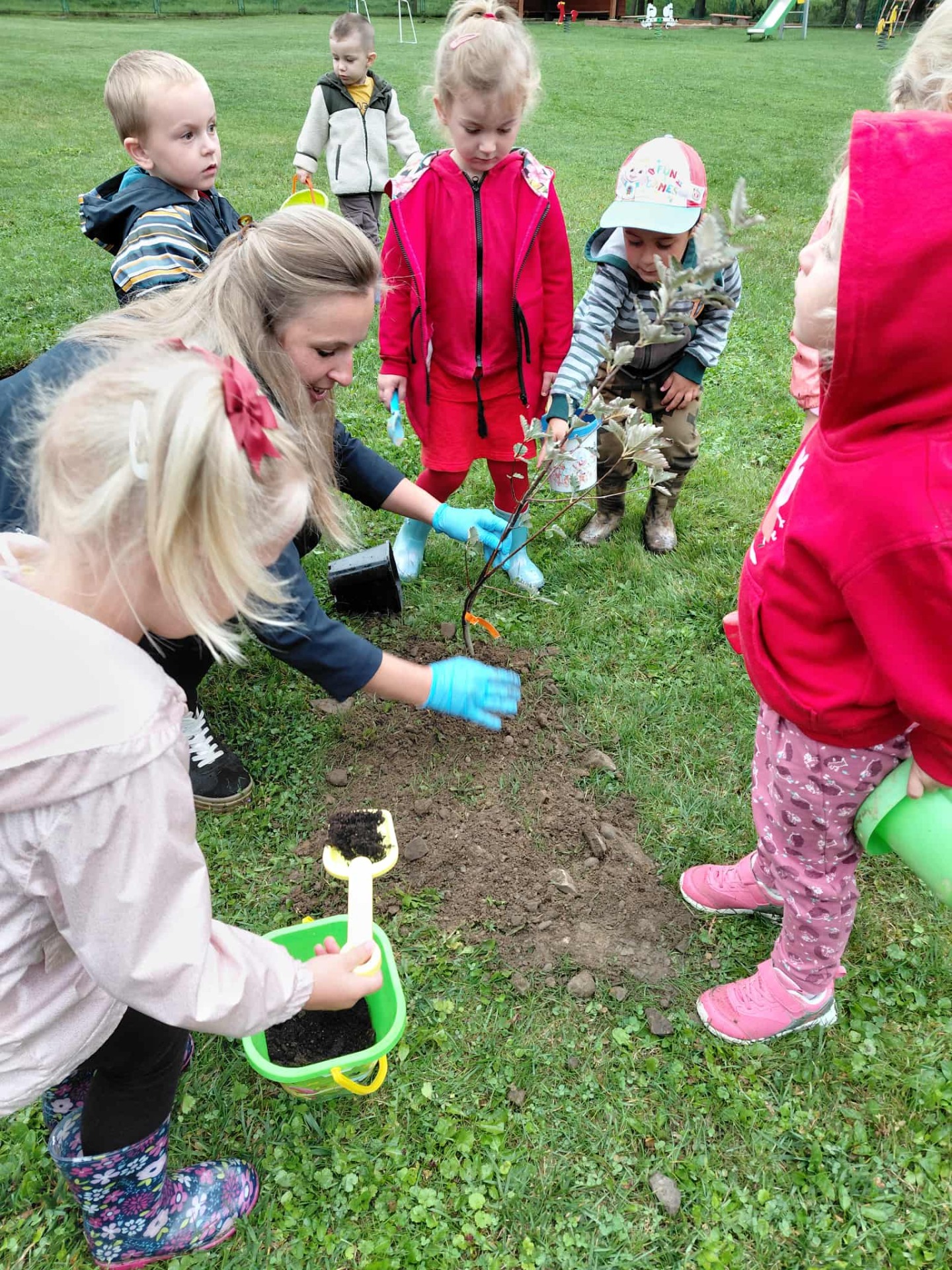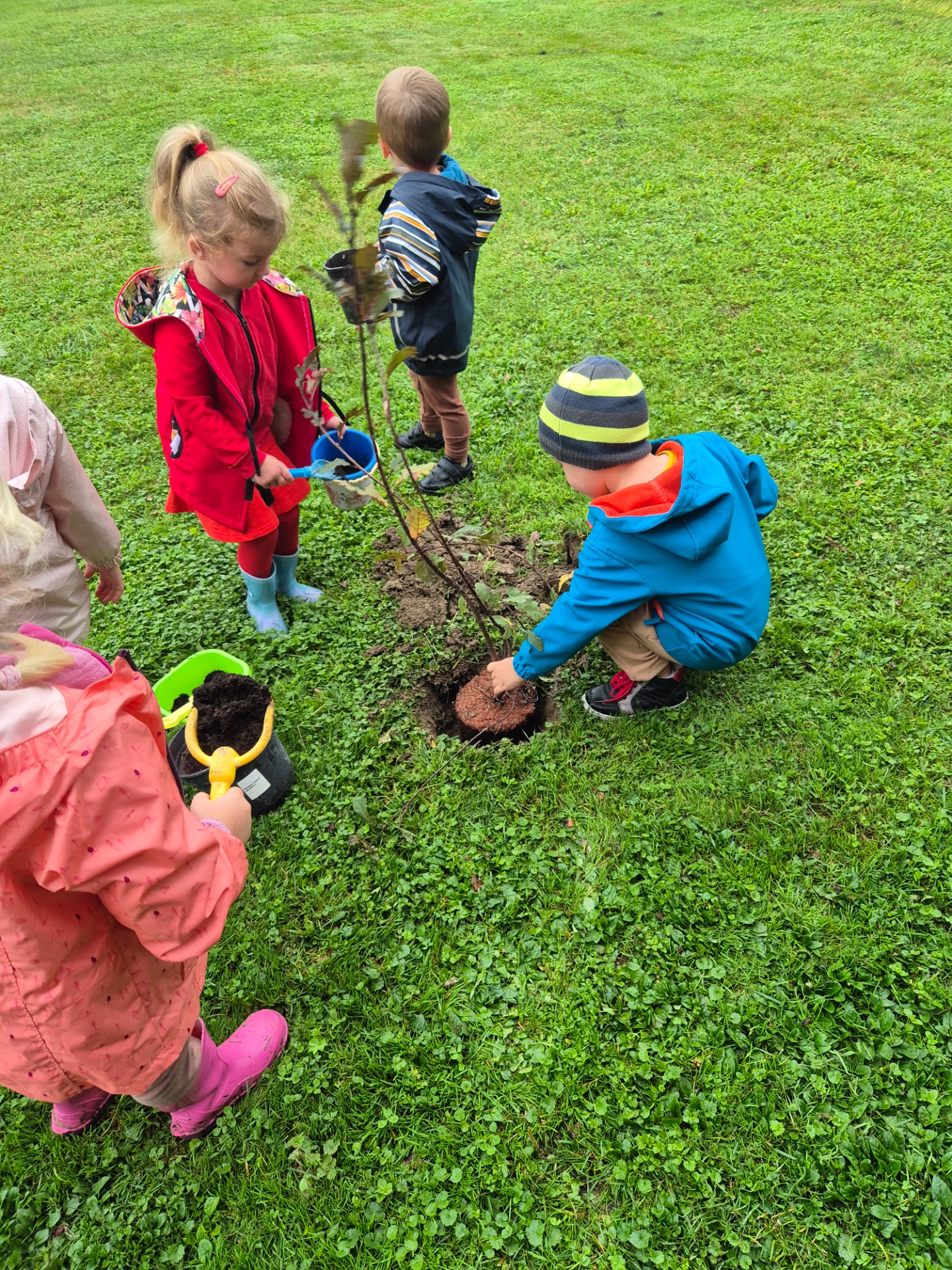 Wszyscy wiemy, że pierwszy Dzień Jesieni przypada na 23 września, dlatego dzieci z naszego przedszkola w ten dzień witały Panią Jesień w nietypowy sposób. Zaczęliśmy od posadzenia w ogrodzie przedszkolnym krzewów oraz różnych sadzonek drzew m.in. lipa, jarzębina. Dzieci dzielnie pomagały, wykazywały zainteresowanie, wkładały sadzonki do dziur, nosiły ziemię.