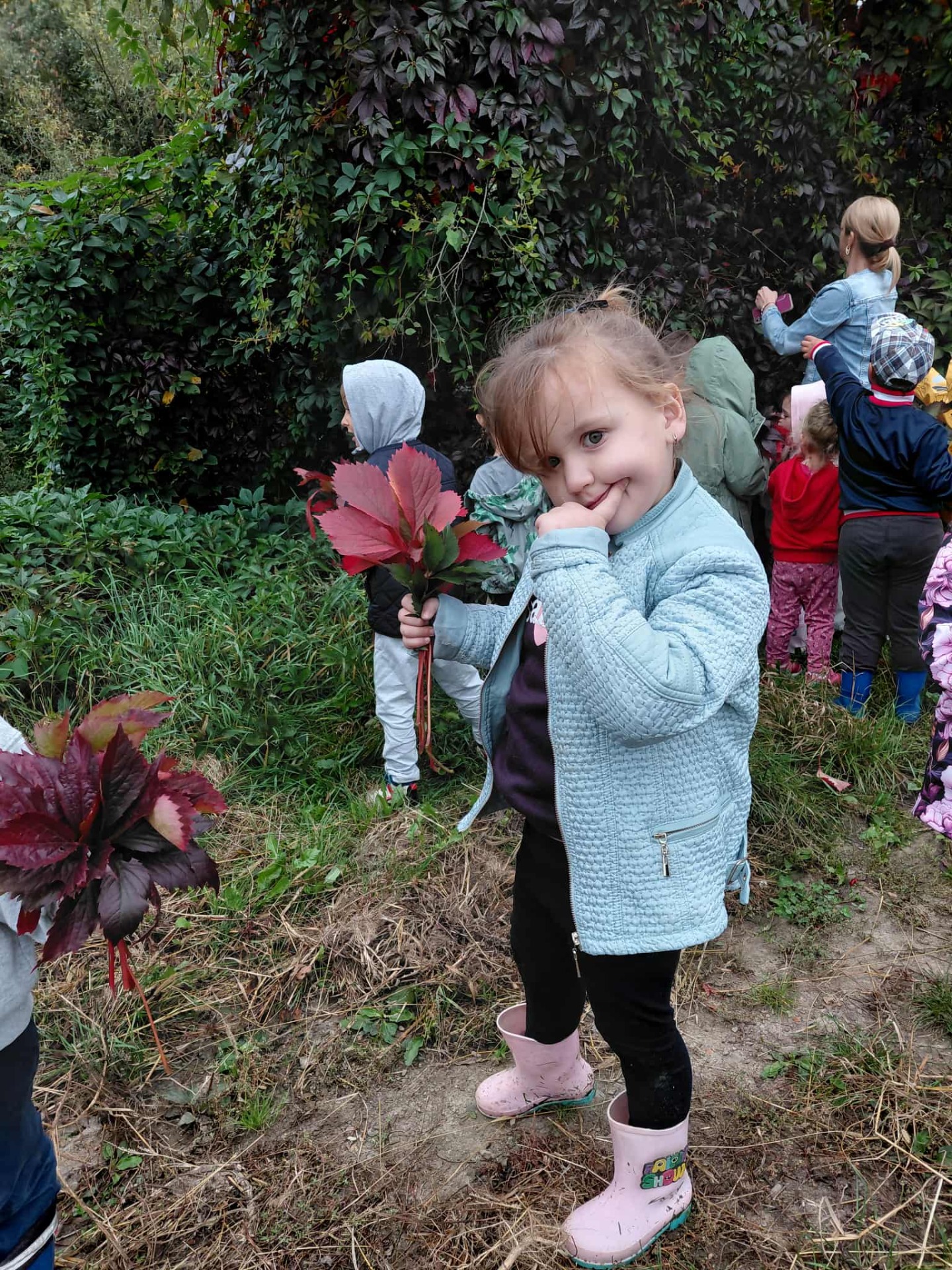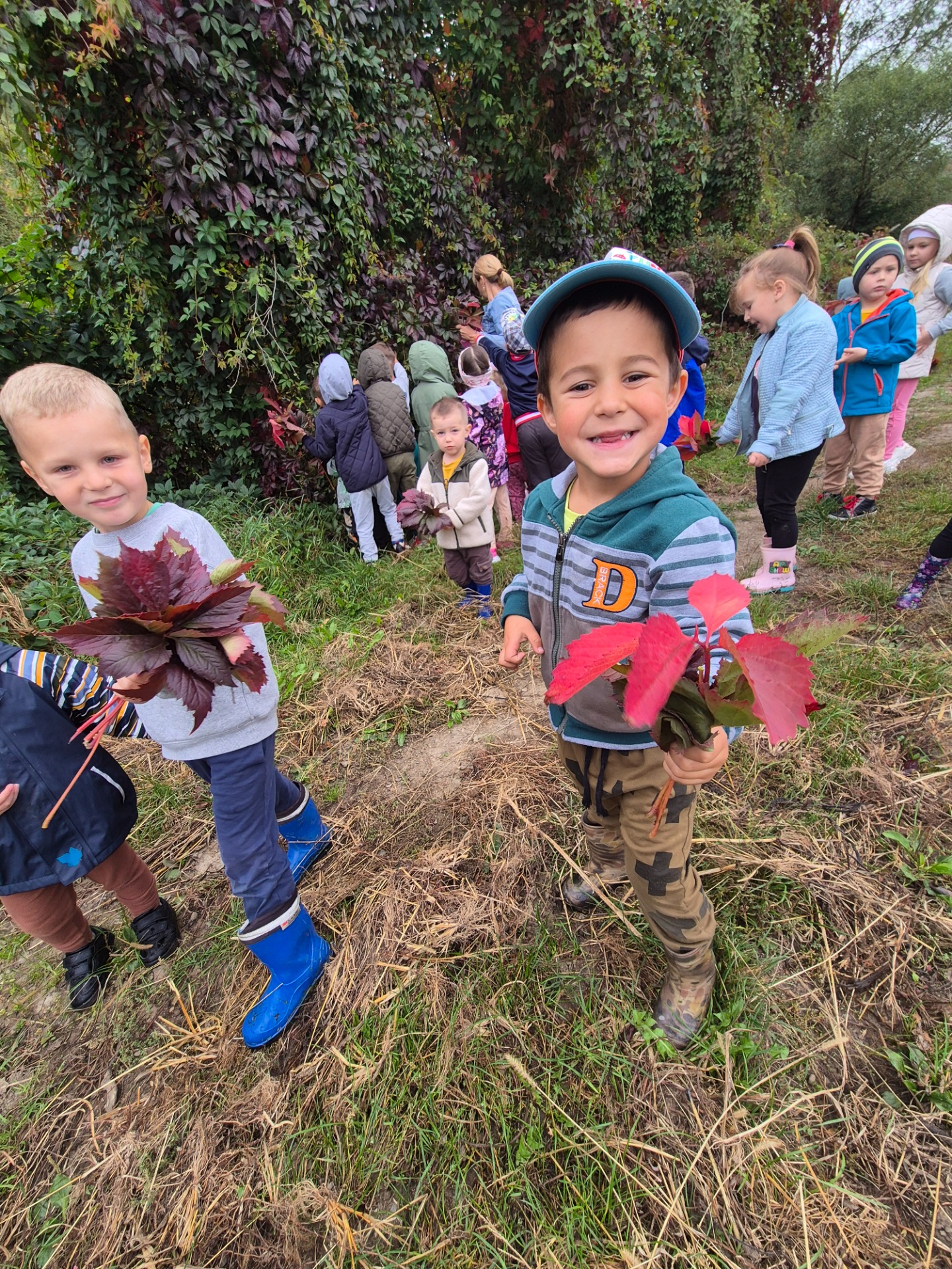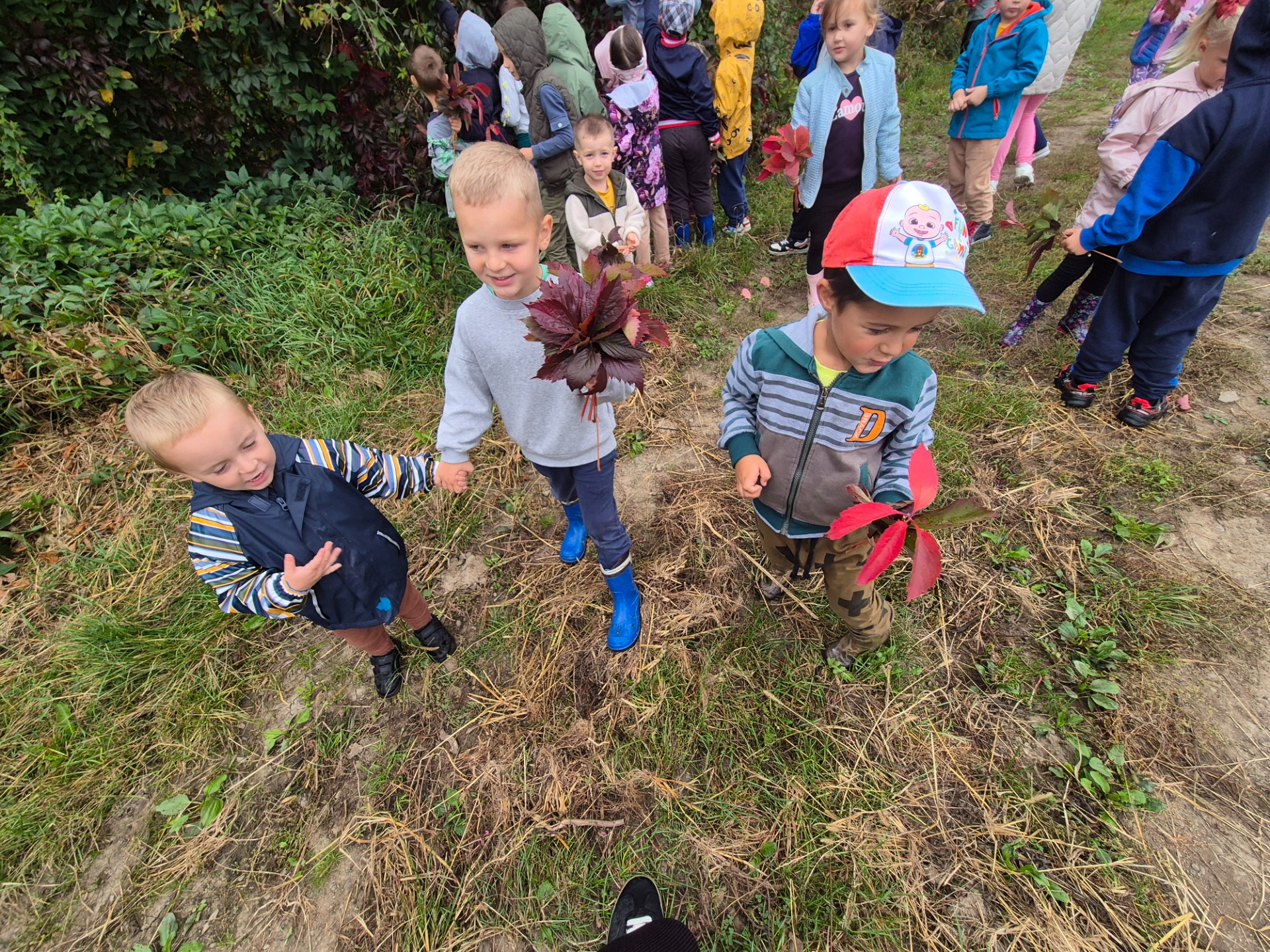 Następnie udaliśmy się na spacer po pobliskiej okolicy, celem obserwacji jesiennych zmian występujących w przyrodzie oraz szukania jesiennych darów. Dzieci nazbierały kolorowych liści, z czego później przygotowały jesienne bukiety. Kilka przedszkolaków przyniosło również kasztany oraz szyszki.