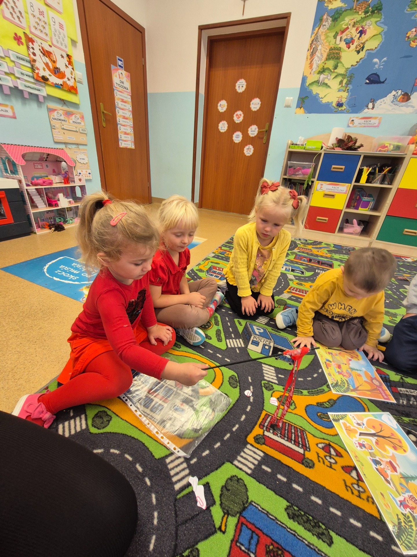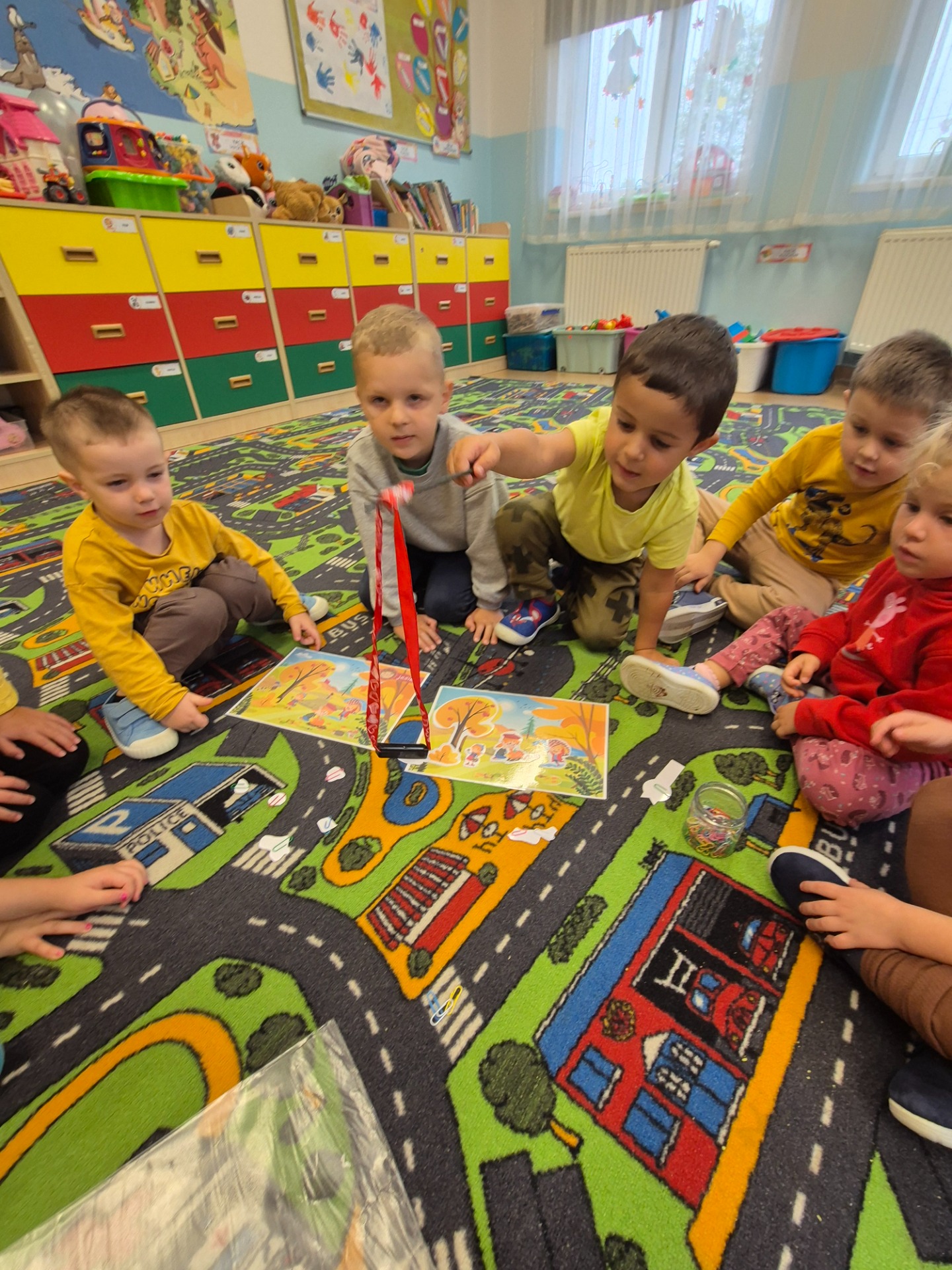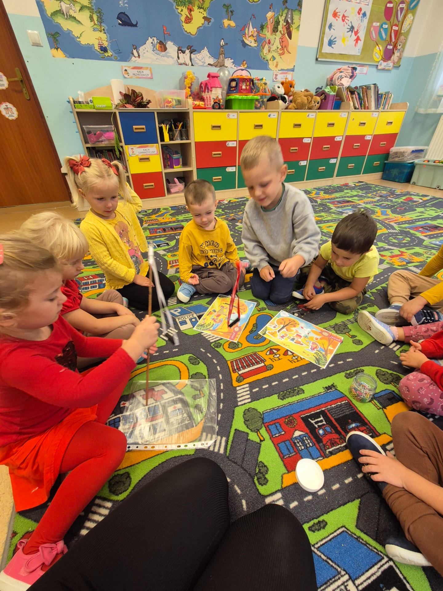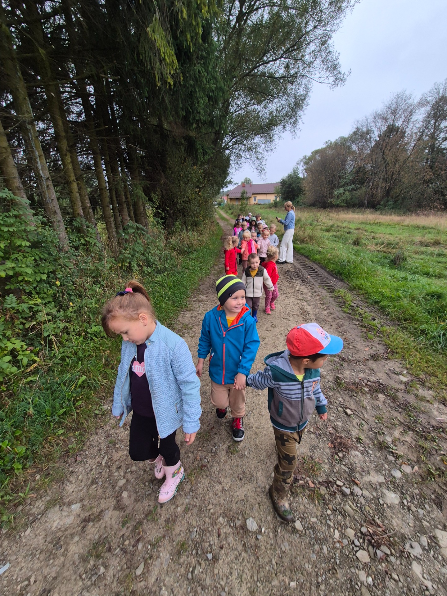 Następnie udaliśmy się na spacer po pobliskiej okolicy, celem obserwacji jesiennych zmian występujących w przyrodzie oraz szukania jesiennych darów. Dzieci nazbierały kolorowych liści, z czego później przygotowały jesienne bukiety. Kilka przedszkolaków przyniosło również kasztany oraz szyszki.