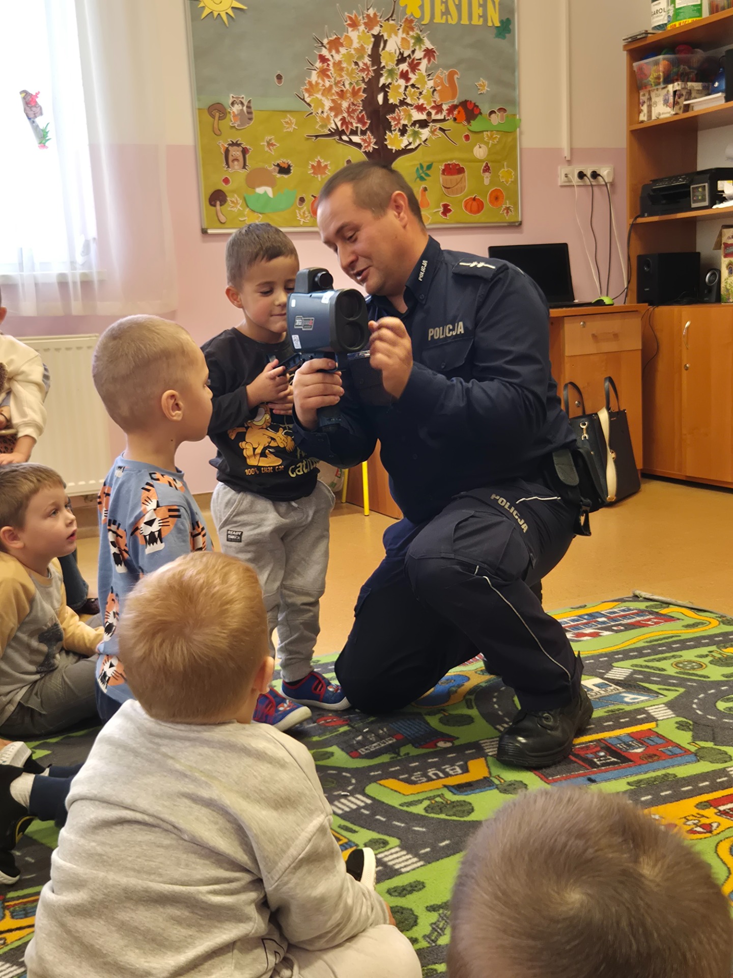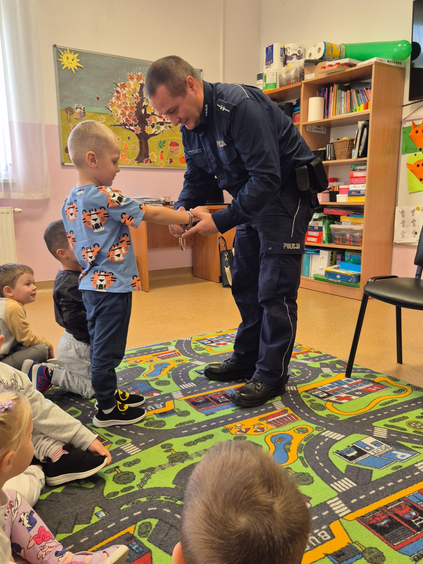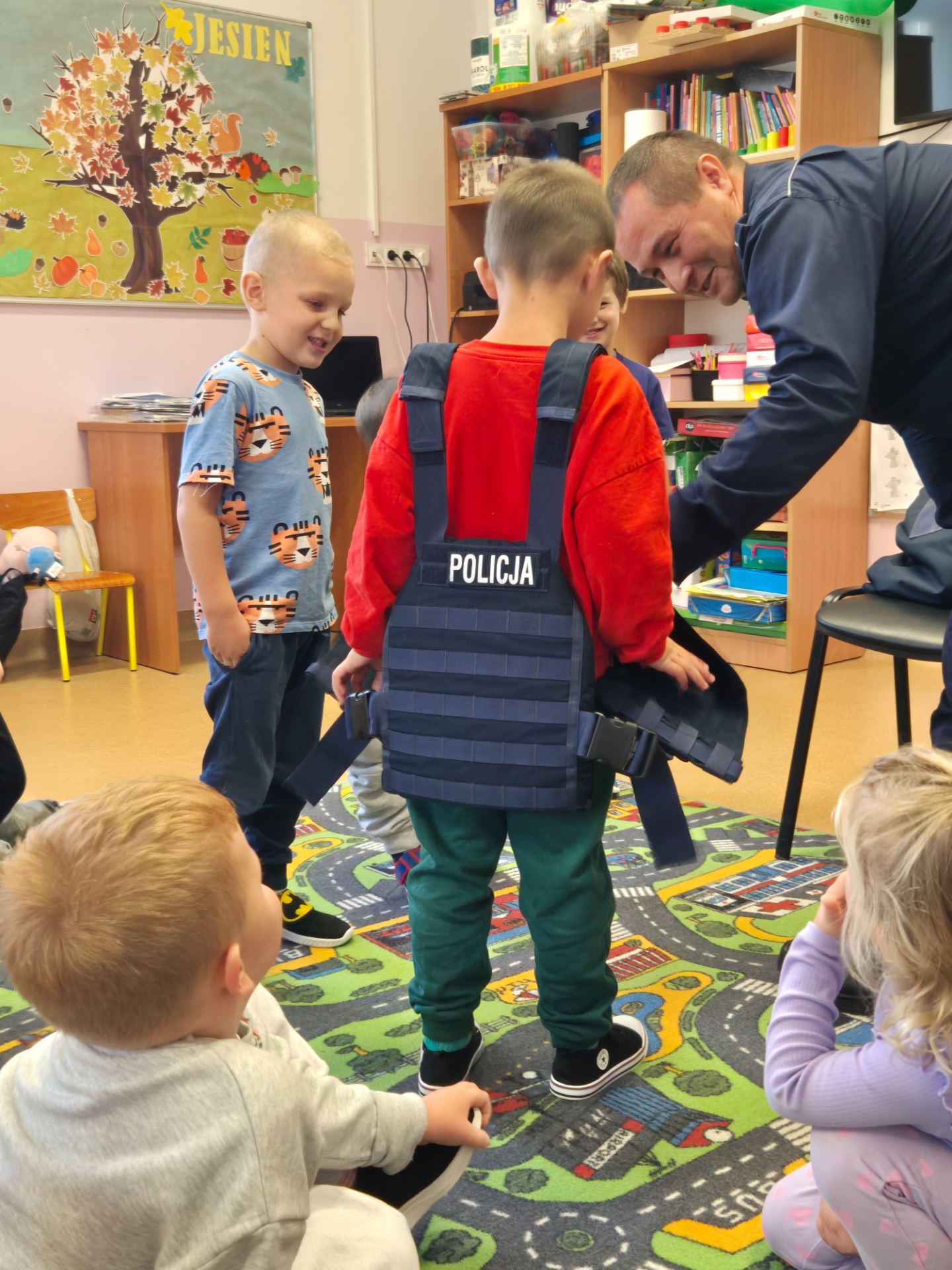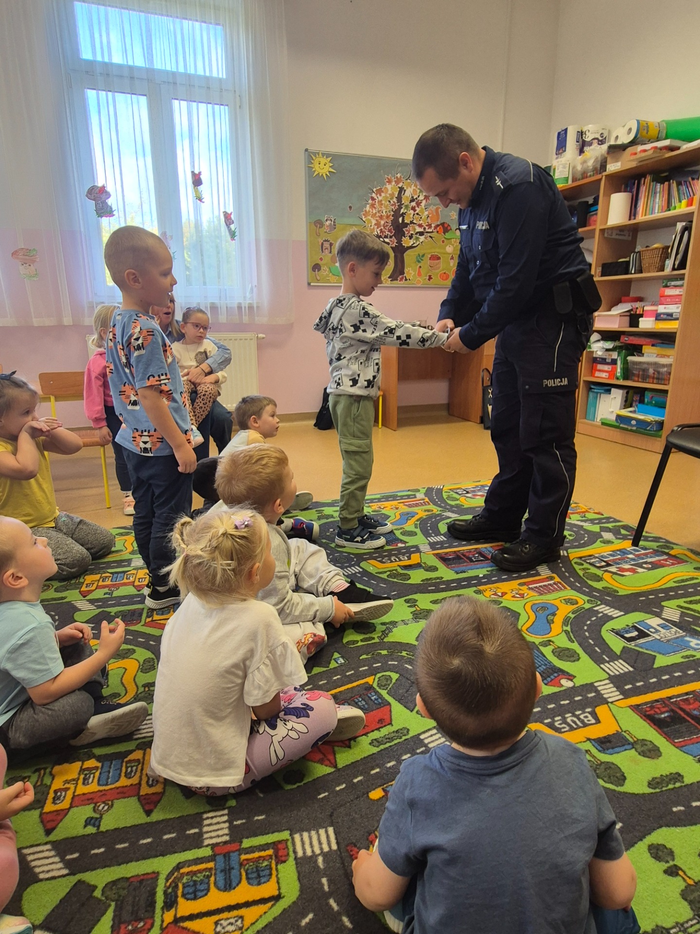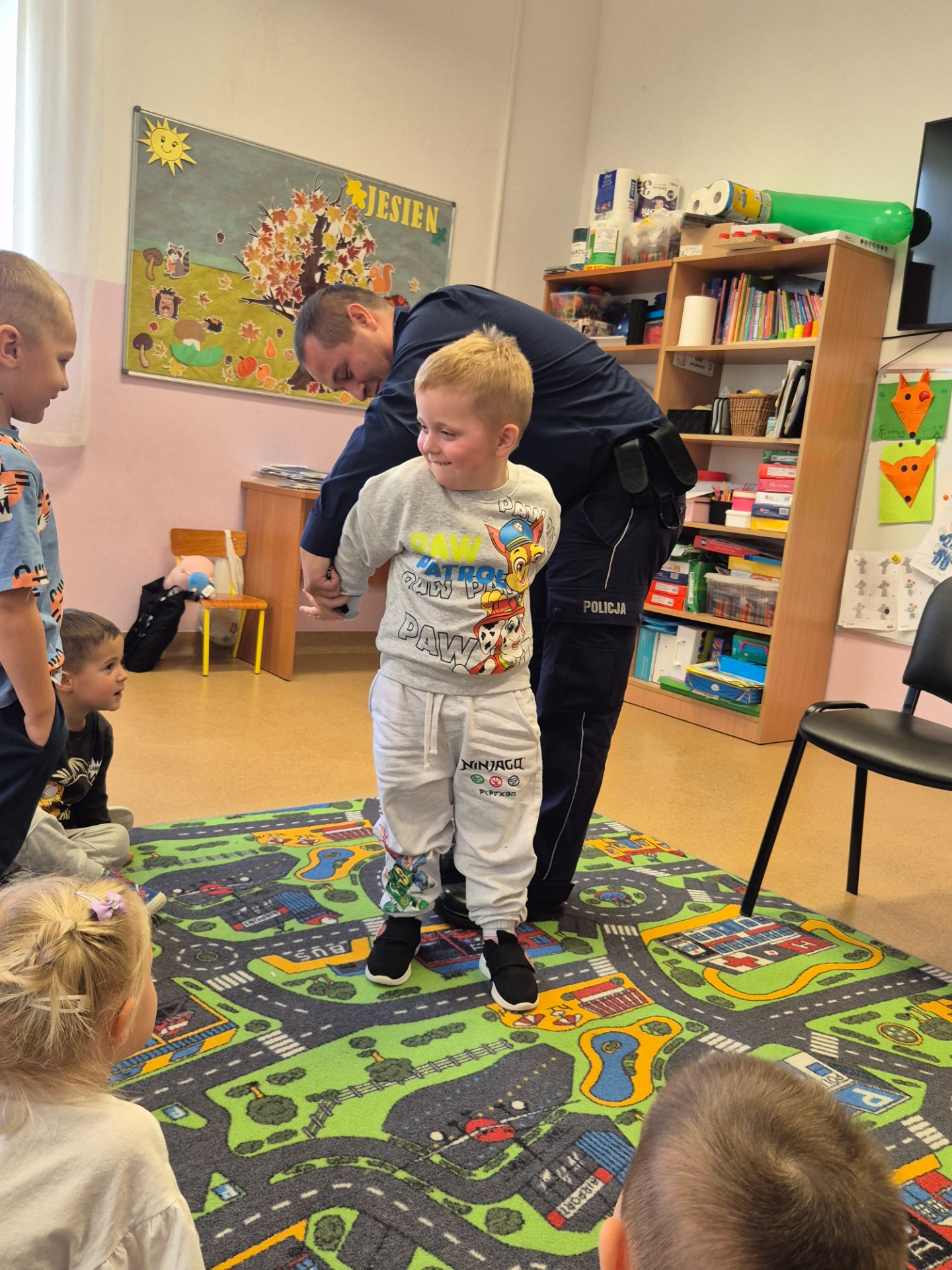 W poniedziałek 13 października 2025 roku przedszkole odwiedził Pan Dzielnicowy Waldemar Pierzga z Komisariatu Policji w Uściu Gorlickim. Pan Policjant podczas pogadanki przybliżył dzieciom informacje związane z bezpieczeństwem na drodze, gdzie należy zachować szczególną ostrożność. Podkreślił także, jak ważne jest noszenie odblasków podczas jesiennej aury. Przedszkolaki z zaciekawieniem słuchały informacji dotyczących numerów alarmowych oraz wiadomości dotyczących spotkania z nieznajomymi osobami. Dziękujemu Panu Dzielnicowemu za przeprowadzenie prelekcji dla dzieci.