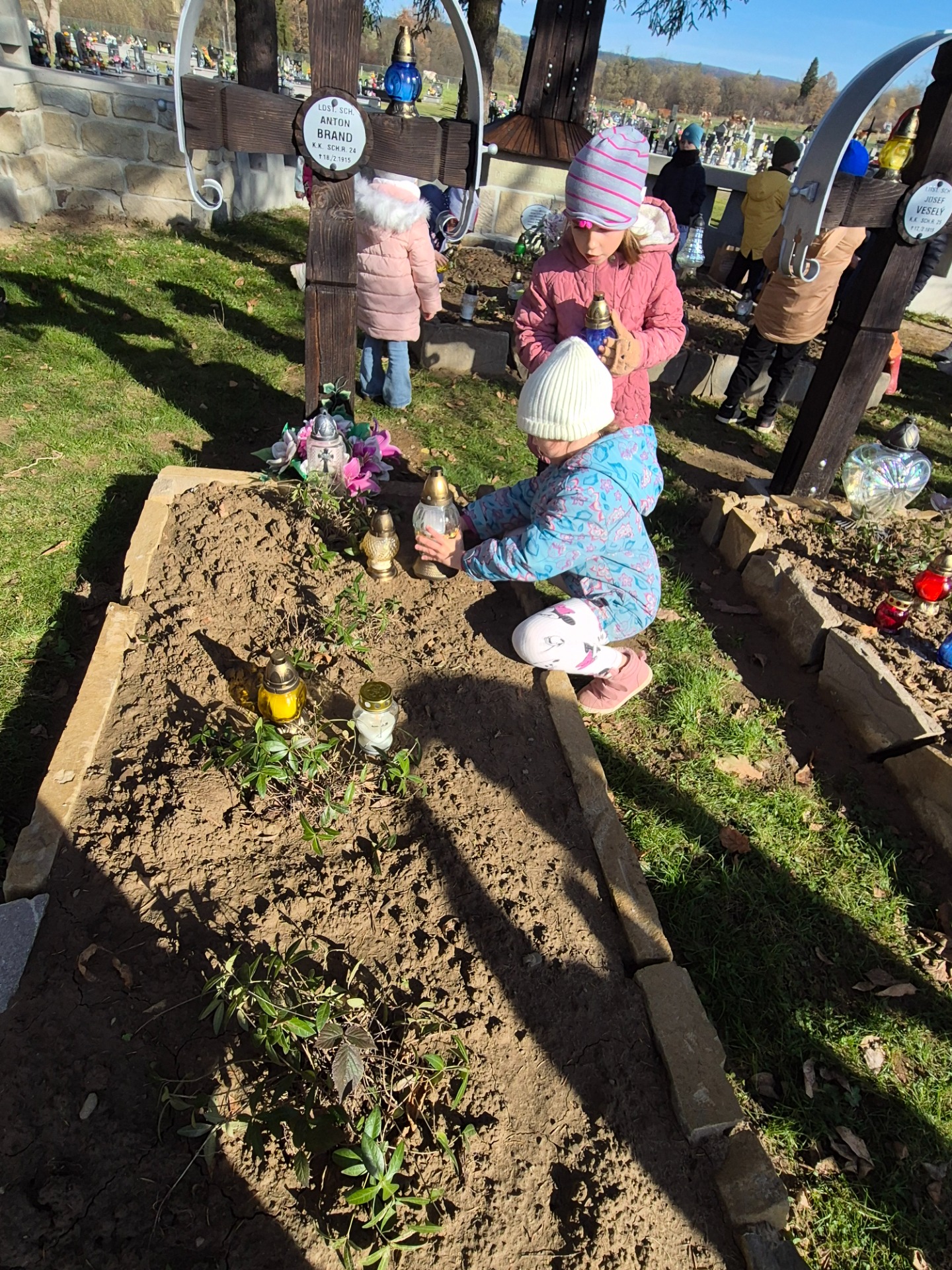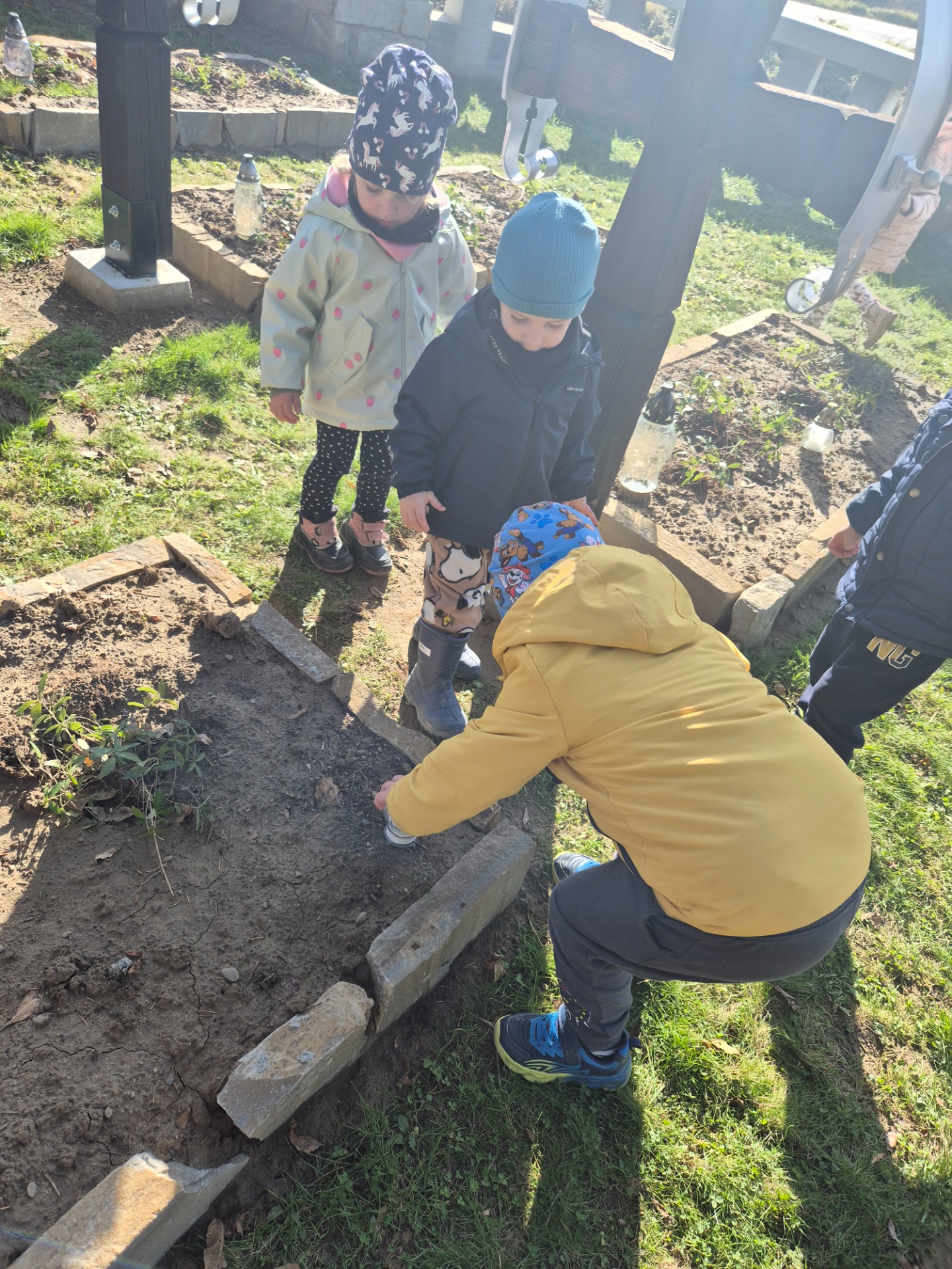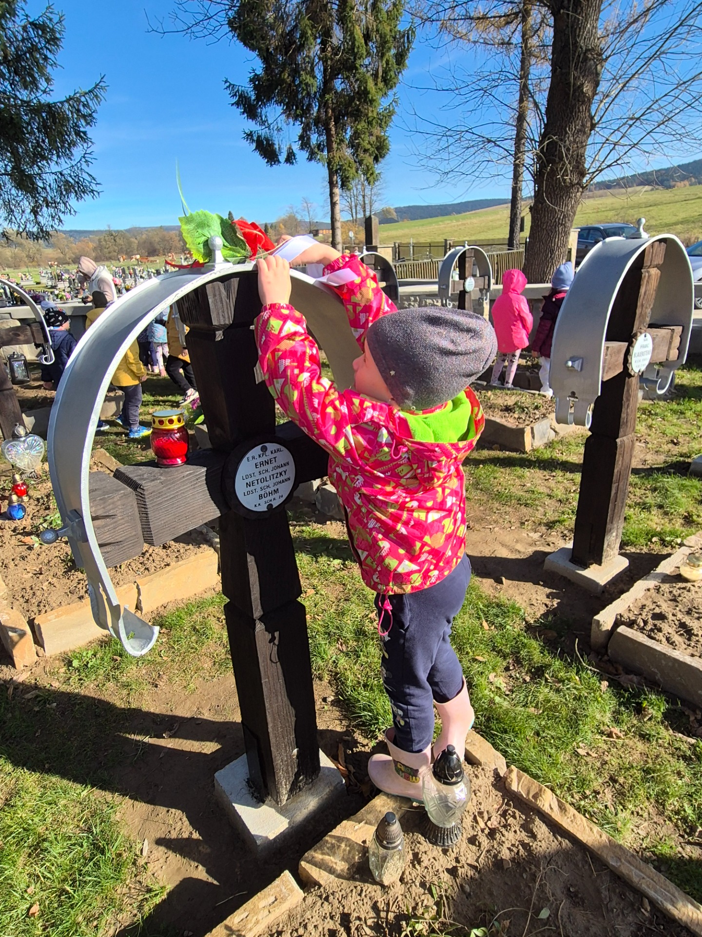 Dnia 30 października 2025 roku dzieci z naszego przedszkola wraz z wychowawcami, wybrały się na cmentarz, celem uczczenia pamięci zmarłych. Dzieci wspólnie z paniami zapaliły znicze na grobach. Poprzez odwiedziny na cmentarzu uczymy dzieci szacunku dla zmarłych i właściwego zachowania się w tym szczególnym miejscu.