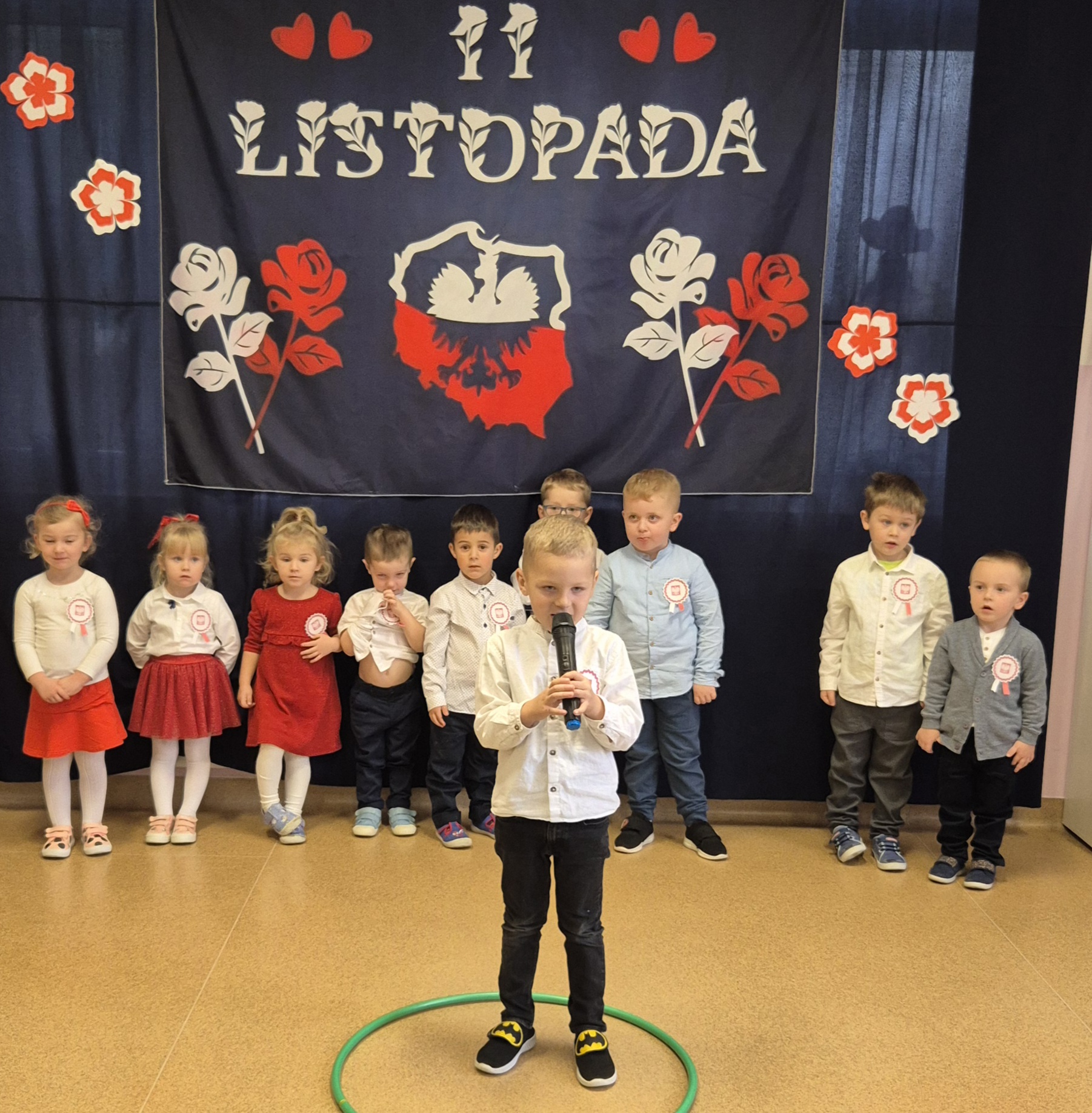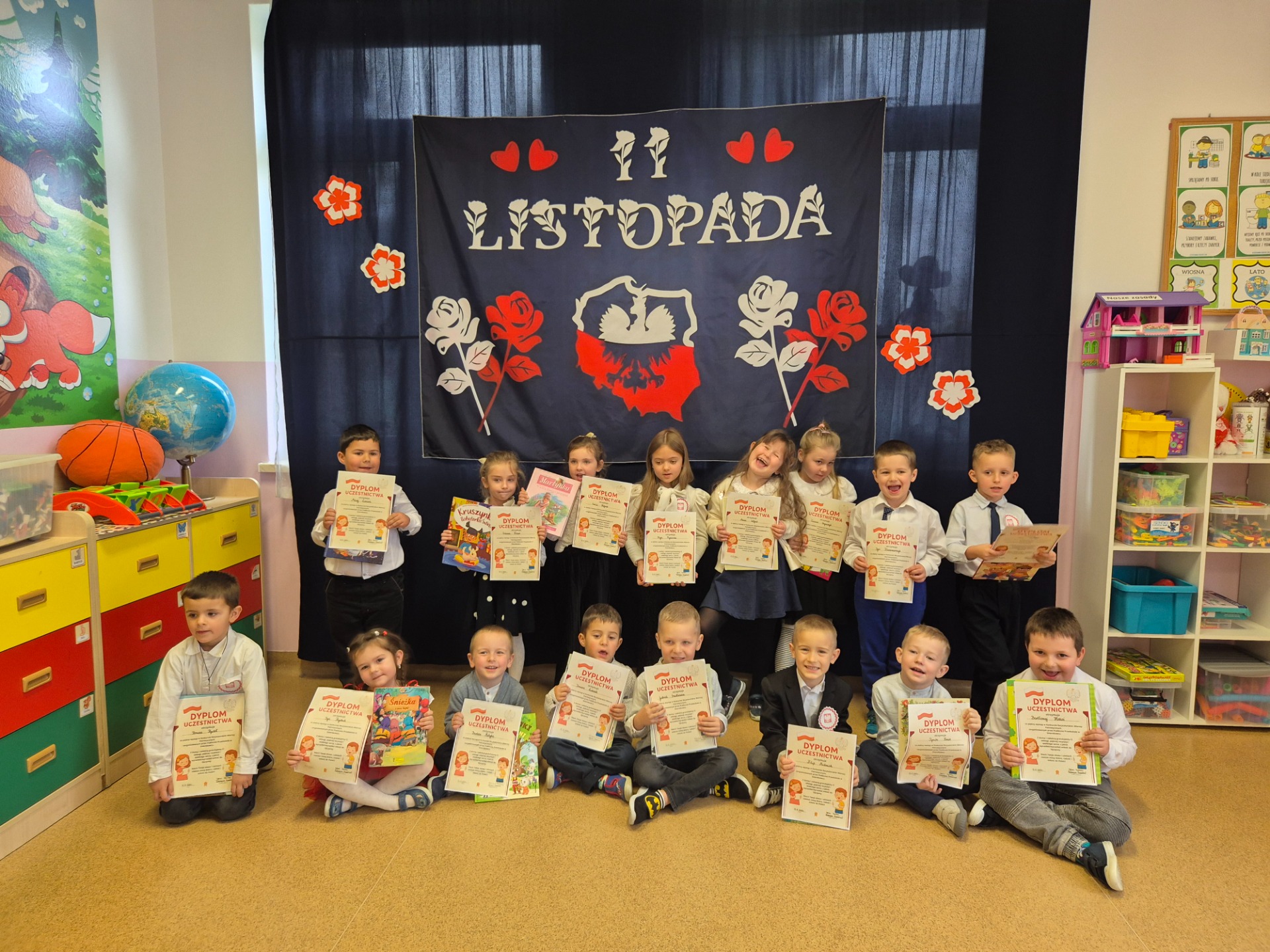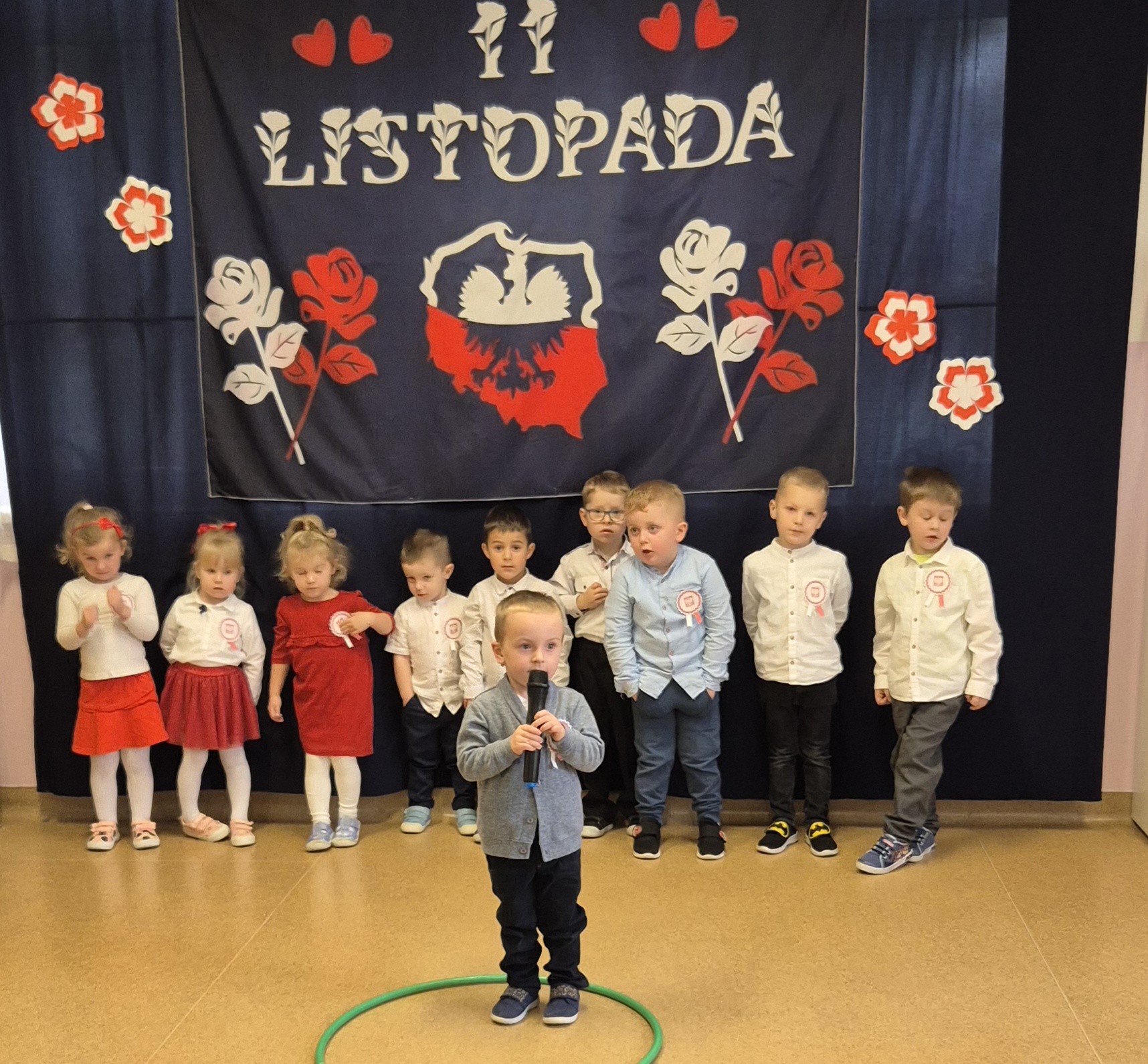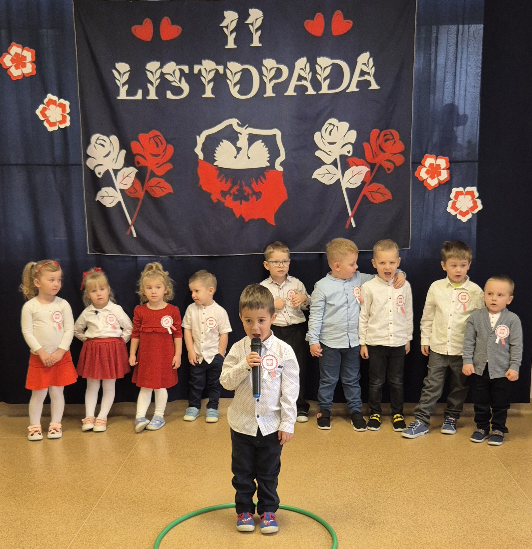 Dzień 11 Listopada to bardzo ważna data w historii naszej Ojczyzny. Dlatego 13 listopada 2025 odbył się w naszym przedszkolu konkurs wierszy patriotycznych. Na początku wydarzenia wszystkie dzieci wraz z wychowawcami oraz Panią Dyrektor odśpiewały hymn narodowy. Następnie obydwie grupy, jako pierwsza wystąpiła grupa 3,4 latków śpiewały piosenki oraz recytowały wiersze patriotyczne, które ćwiczyły pod okiem rodziców w domu. Wszyscy otrzymali gromkie brawa, dyplomy uczestnictwa oraz drobne upominki w postaci nagród książkowych.