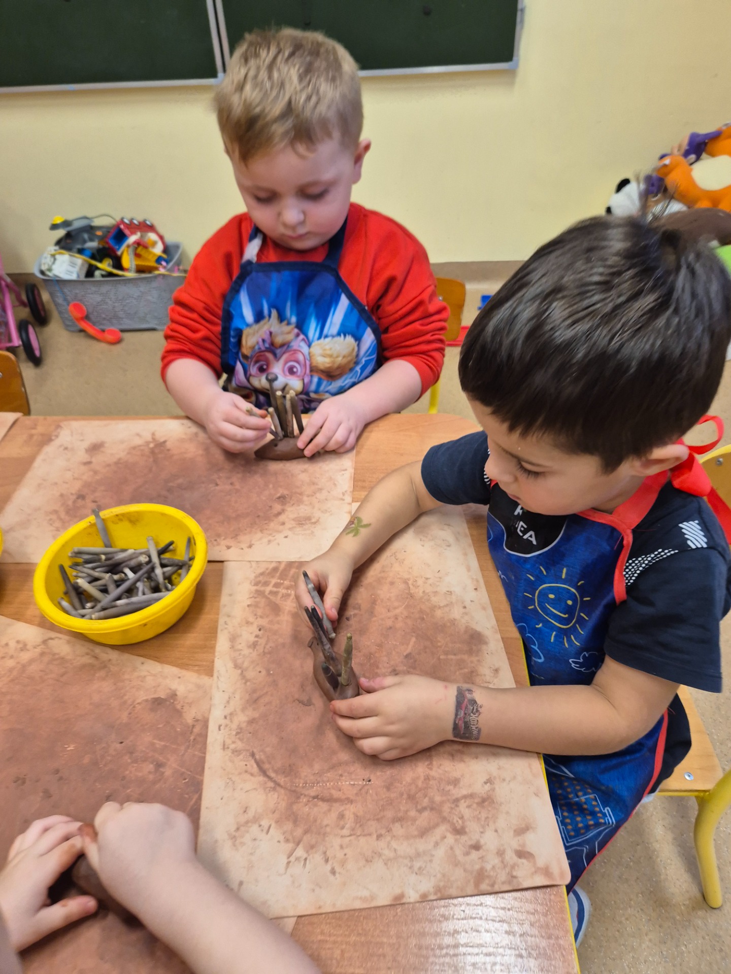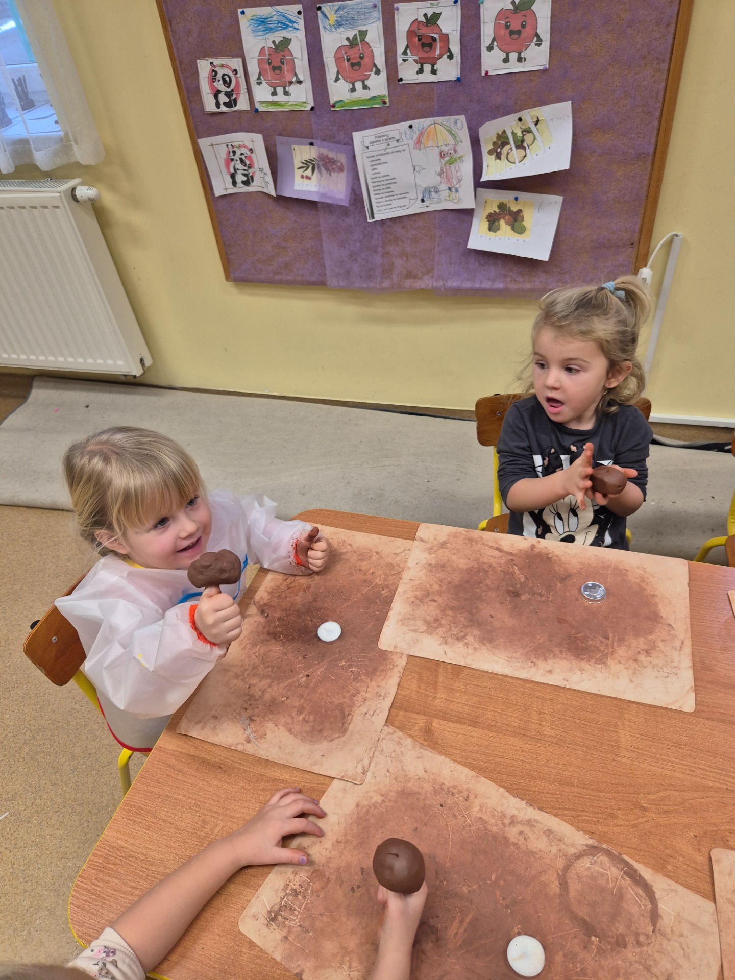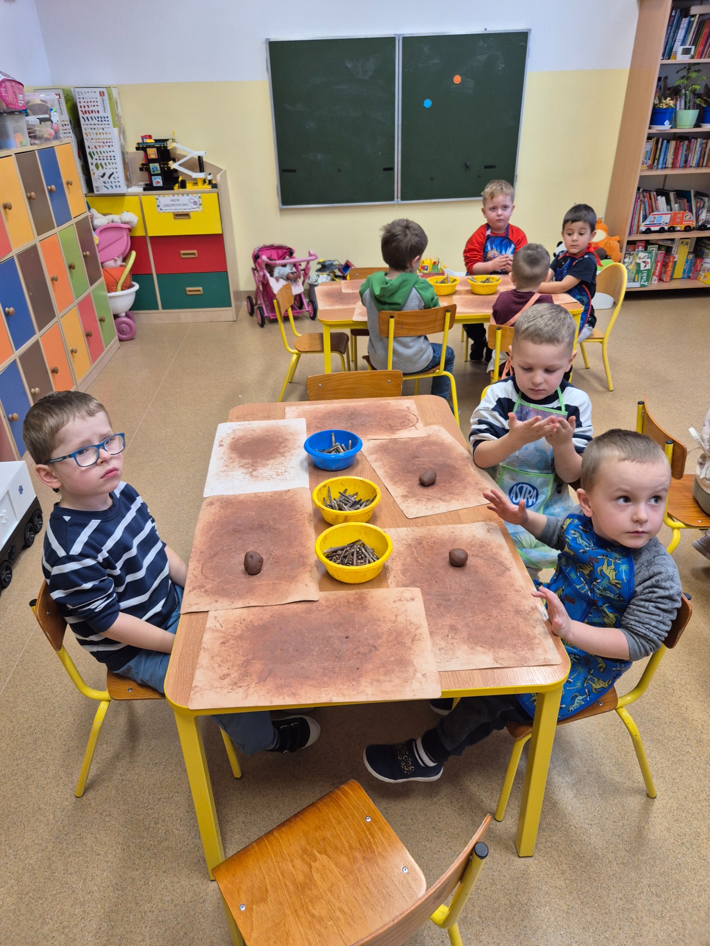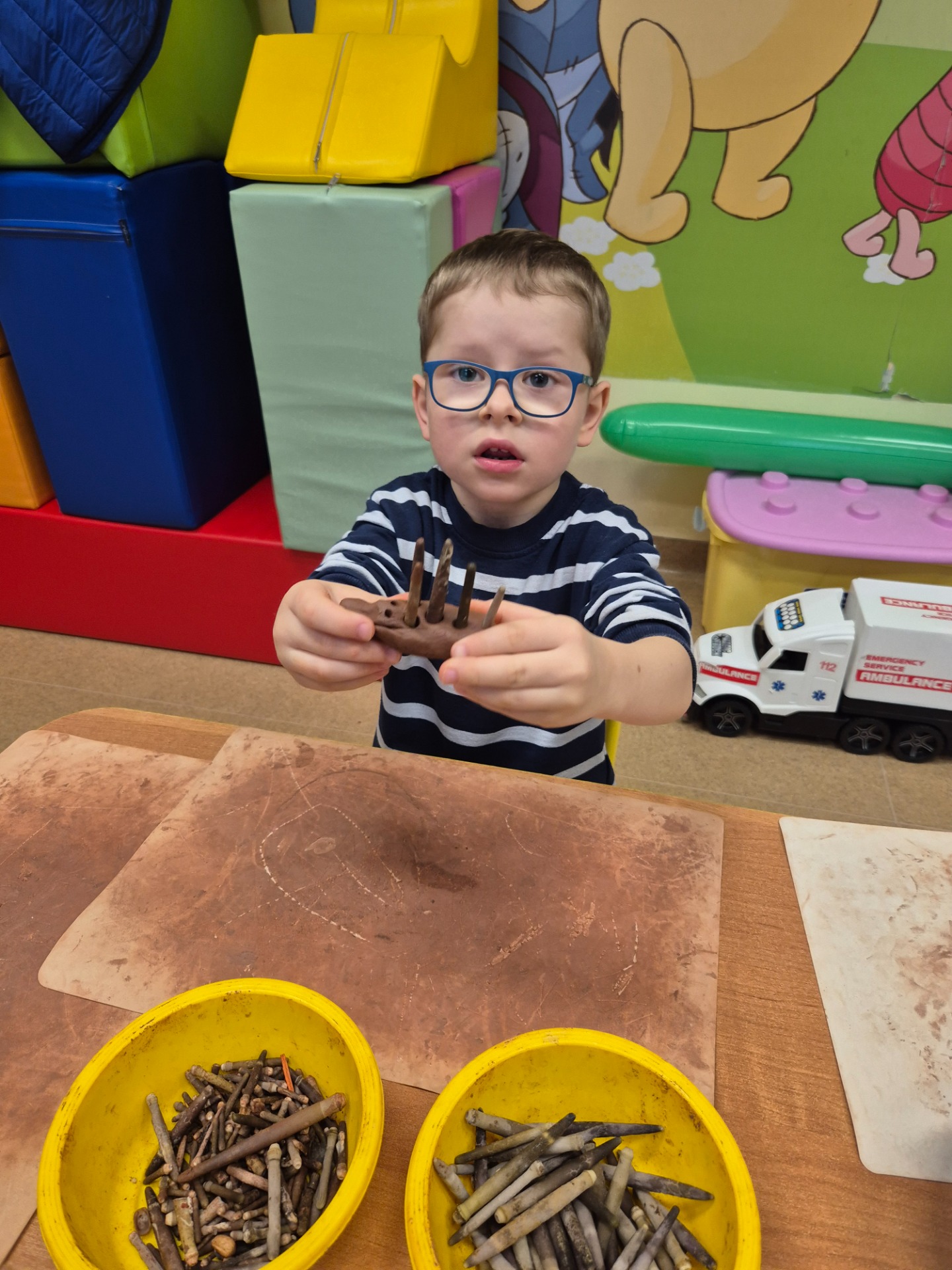 W ramach jesiennych zajęć dla dzieci 26 listopada 2025 roku zorganizowane zostały zajęcia „Jesień z gliną”. Pan prowadzący z Fundacji Polski Bursztyn przybliżył dzieciom w prosty i ciekawy sposób co można zrobić z gliny. Przedszkolaki w czasie zajęć tworzyły jeża z gliny z prawdziwymi kolcami jeżowca, podstawkę na drobne elementy, która była zdobiona techniką pozłotniczą. Na koniec dzieci wykonały jeszcze podstawkę pod świeczkę na jesienne wieczory. Zajęcia z gliną bardzo podobały się dzieciom. Po kilku dniach, kiedy wytwory z gliny całkowicie wyschły przedszkolaki zabrały je do domu.