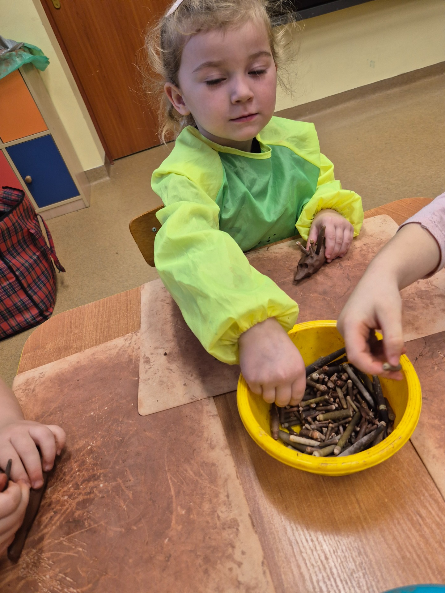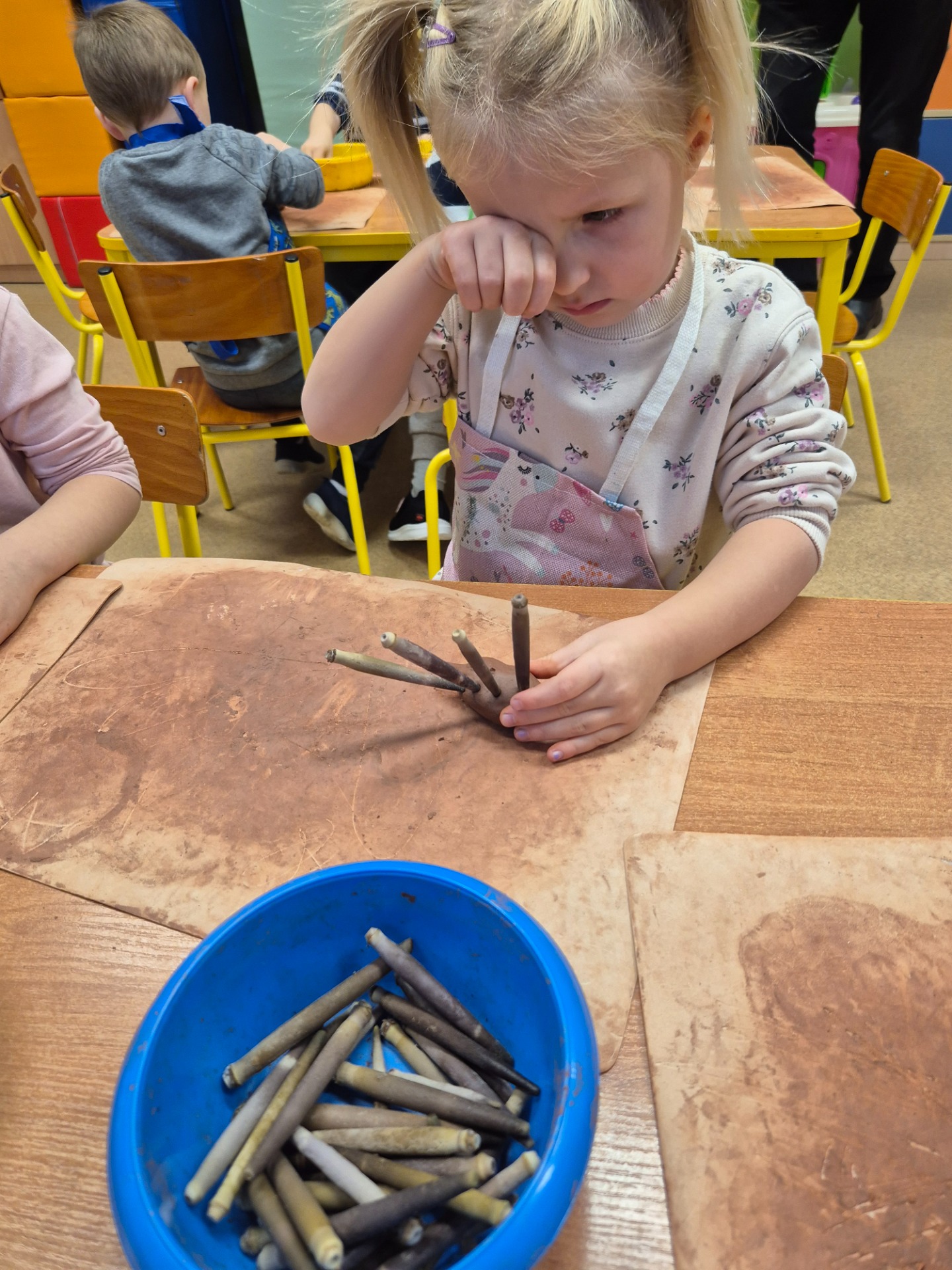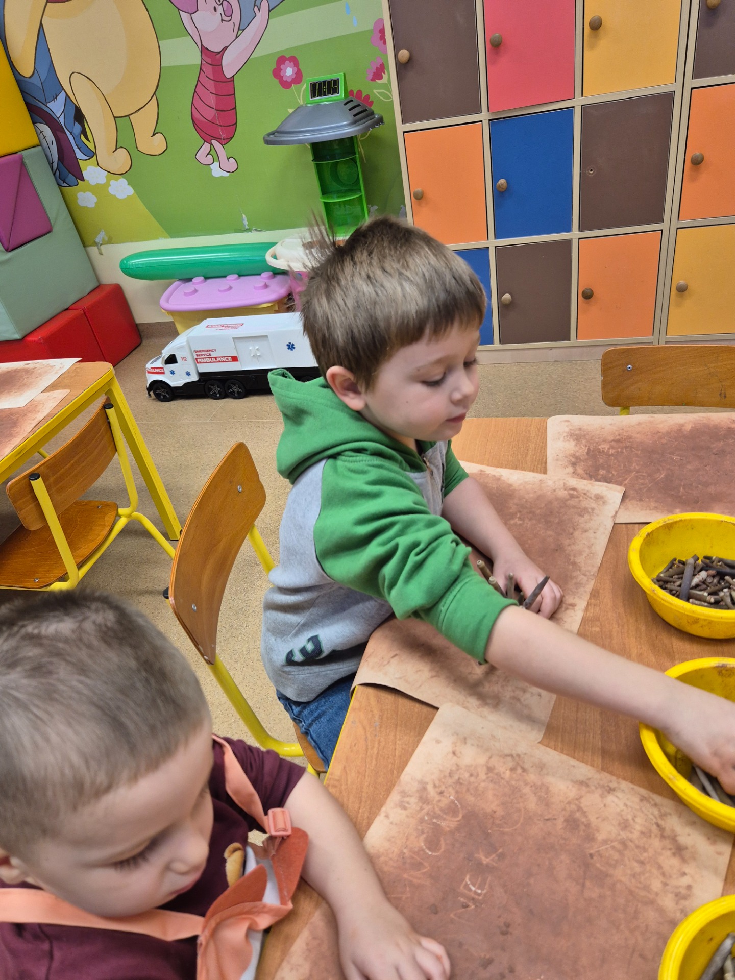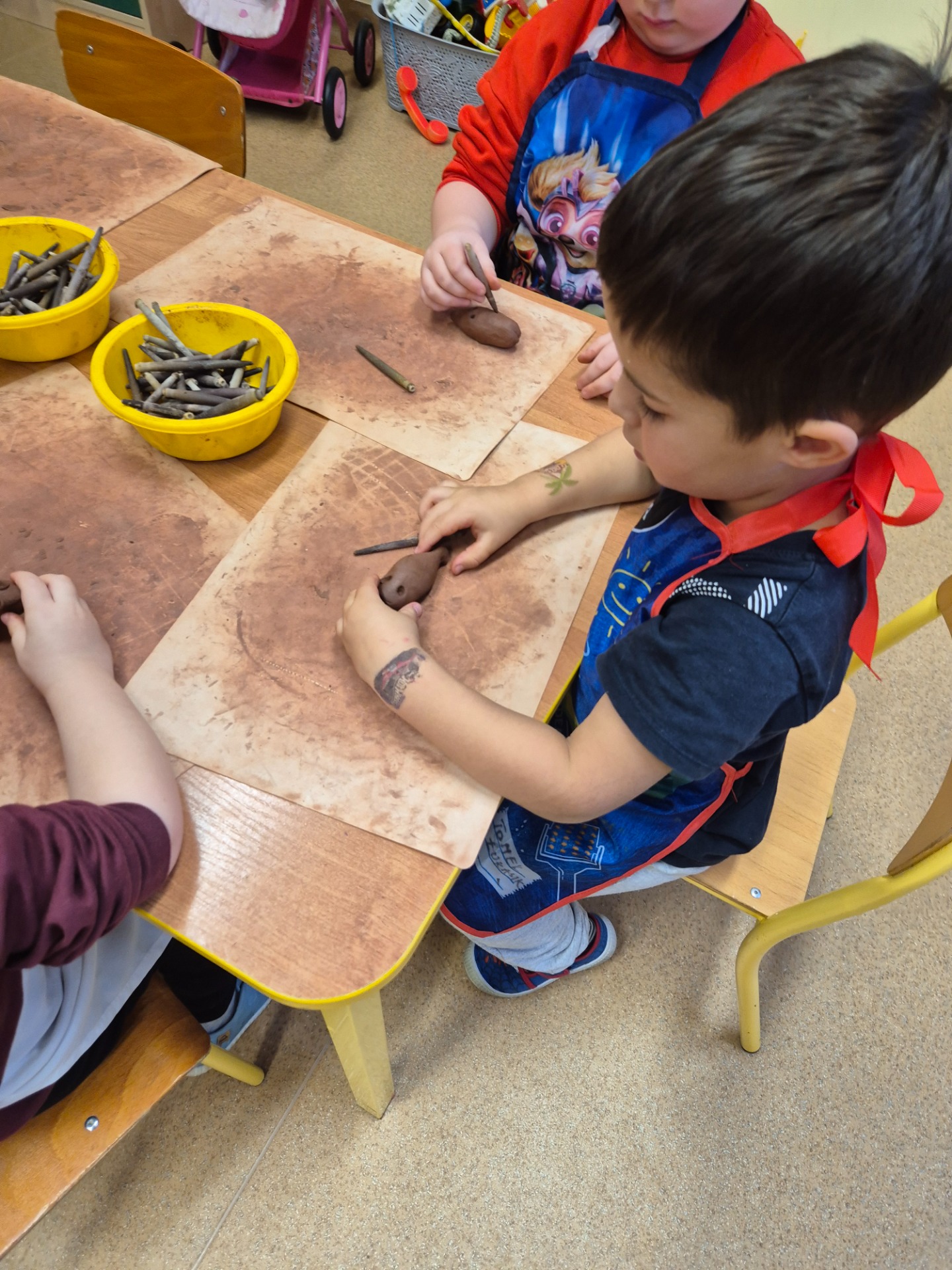 W ramach jesiennych zajęć dla dzieci 26 listopada 2025 roku zorganizowane zostały zajęcia „Jesień z gliną”. Pan prowadzący z Fundacji Polski Bursztyn przybliżył dzieciom w prosty i ciekawy sposób co można zrobić z gliny. Przedszkolaki w czasie zajęć tworzyły jeża z gliny z prawdziwymi kolcami jeżowca, podstawkę na drobne elementy, która była zdobiona techniką pozłotniczą. Na koniec dzieci wykonały jeszcze podstawkę pod świeczkę na jesienne wieczory. Zajęcia z gliną bardzo podobały się dzieciom. Po kilku dniach, kiedy wytwory z gliny całkowicie wyschły przedszkolaki zabrały je do domu.
