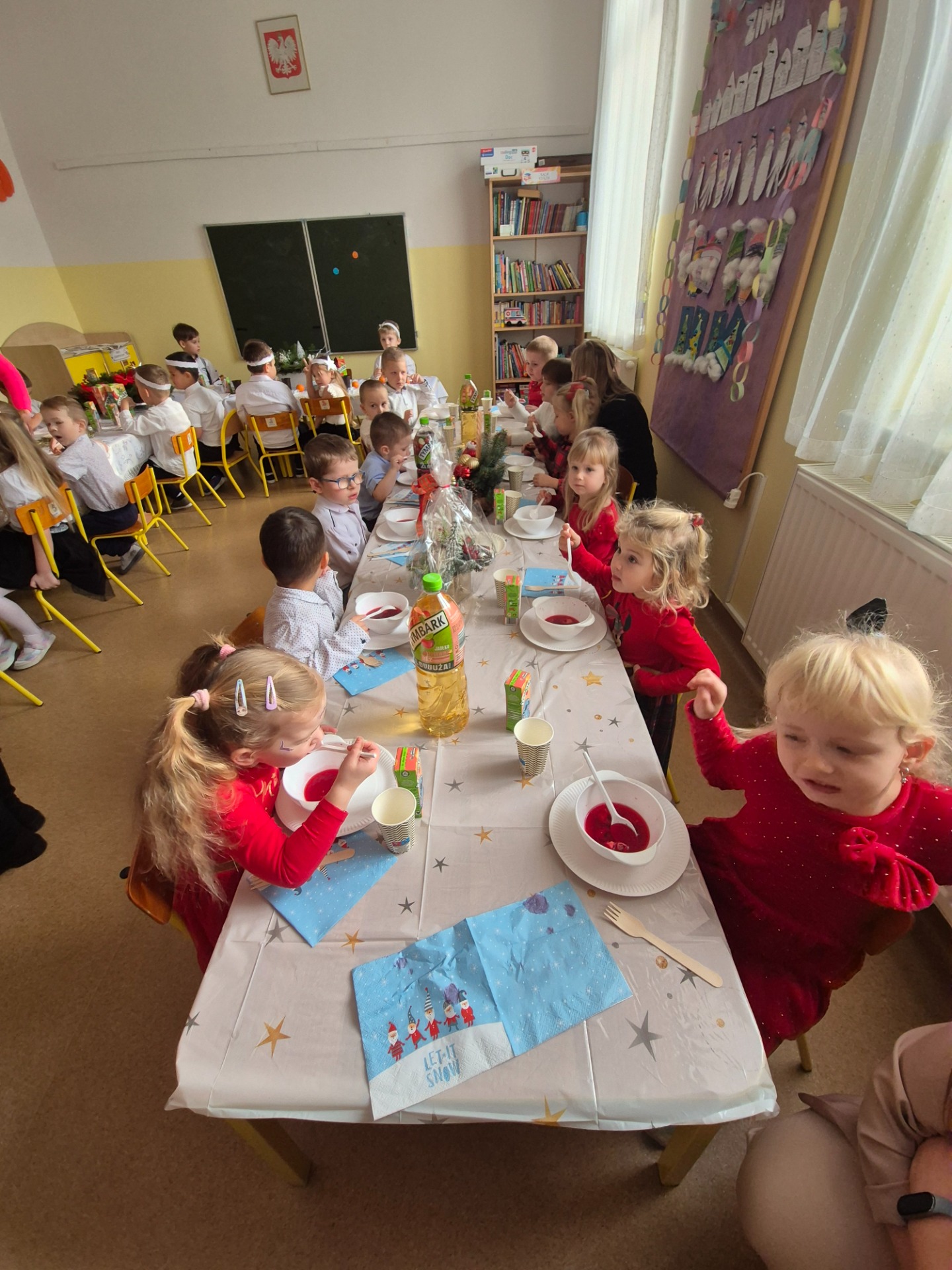 Słowa powyższej kolędy oraz wiele innych pięknych kolęd można było usłyszeć 18 grudnia 2025 roku w naszym przedszkolu, kiedy odbyła się uroczysta wigilia. Na początku grupa 3,4 – latków zaśpiewała świąteczne piosenki oraz powiedziała kilka wierszyków. Jako druga wystąpiła grupa 5,6 – latków, która również umiliła czas świątecznym śpiewaniem i wierszykami. W dalszej części Pani Dyrektor złożyła wszystkim nauczycielom, pracownikom, rodzicom i dzieciom serdeczne życzenia świąteczne. Po występach przyszedł czas na wspólną wigilię przygotowaną przez rodziców, gdzie wszyscy składali sobie życzenia, kolędowali i rozmawiali przy stole. W dzień przedszkolnej wigilii panowała radosna, świąteczna atmosfera.